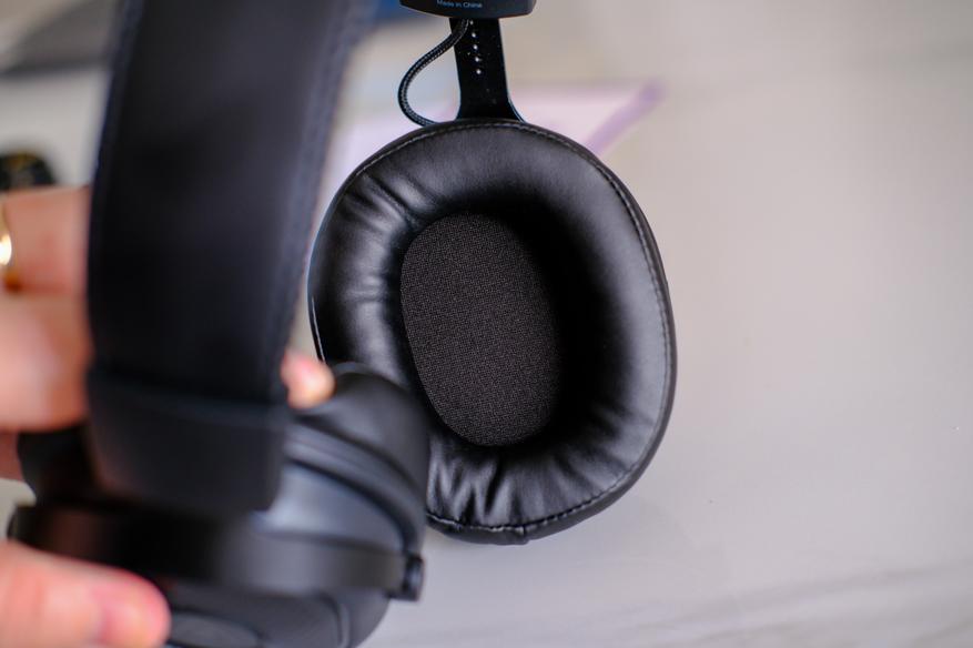 Прилегание к ушам сделано через мягкие амбушюры покрытые эко-кожей. Сами динамики прикрыты тканью.