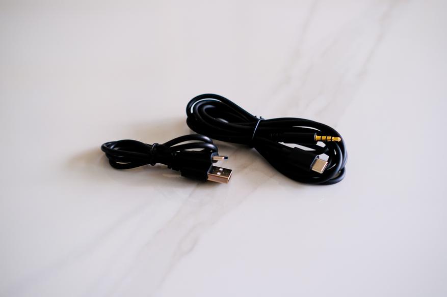 Вот два шнура. Первый служит для зарядки встроенной батареи наушников, а второй нужен в том случае, если мы хотим подключить наушники к источнику звука с 3.5мм выходом.