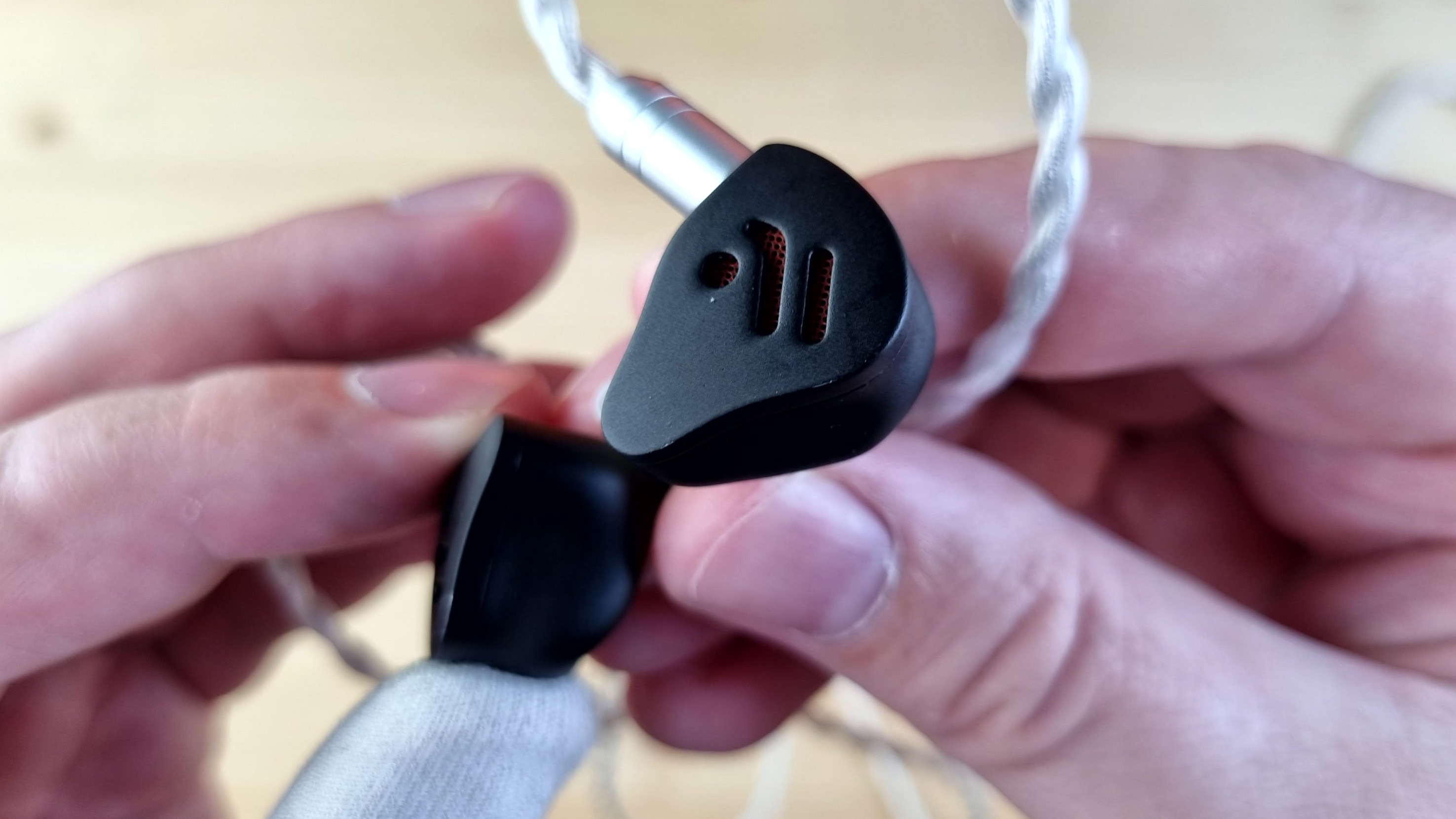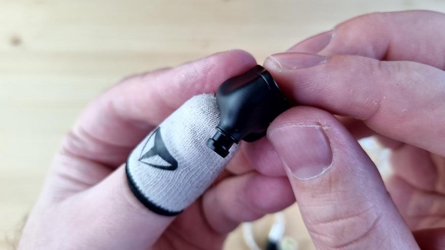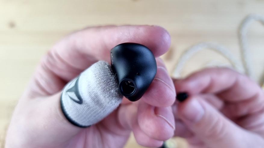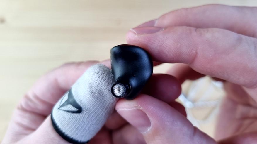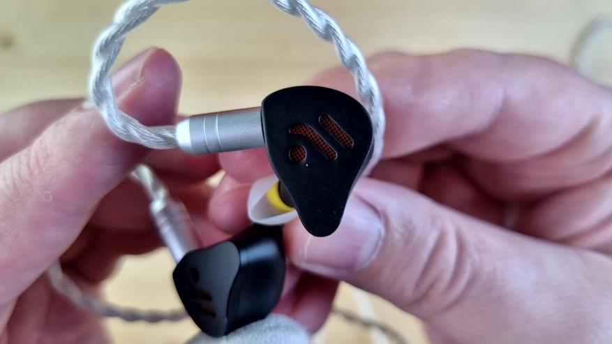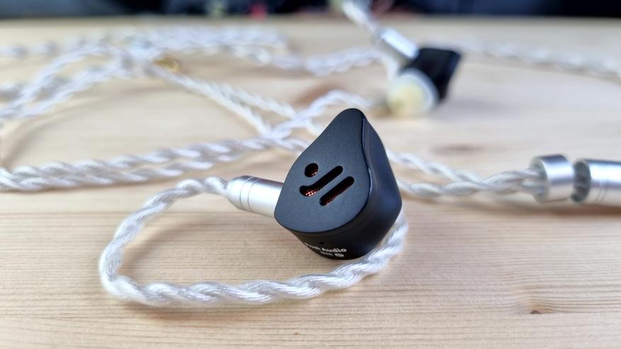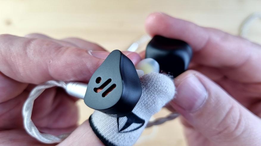 Чашечки полностью из металла, с парой отверстий для компенсации, расположенных сзади и изнутри, звуководом, выполняющим роль сменных фильтров, и сквозной текстурой на внешней части. То есть акустический тип у наушников — полуоткрытые.