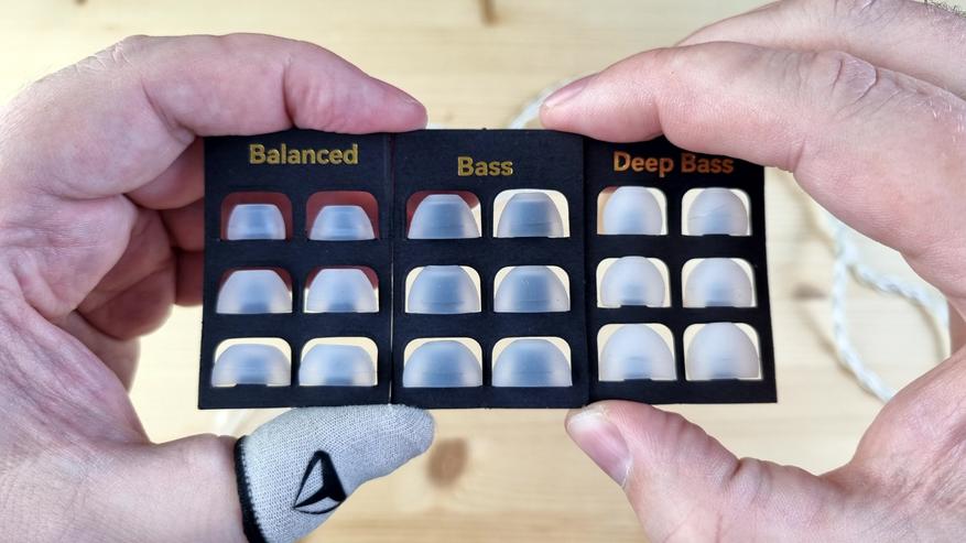 Внутри была документация, простенький плотный бокс, пара фильтров и три набора фирменных силиконовых амбушюр разной формы.