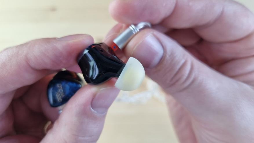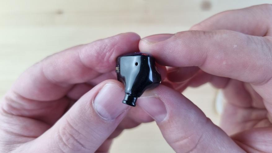 Чашечки сделаны из гипоаллергенной смолы, с довольно узким звуководом, отверстиями для компенсации направленными вверх и назад и абстрактно оформленной внешней частью.