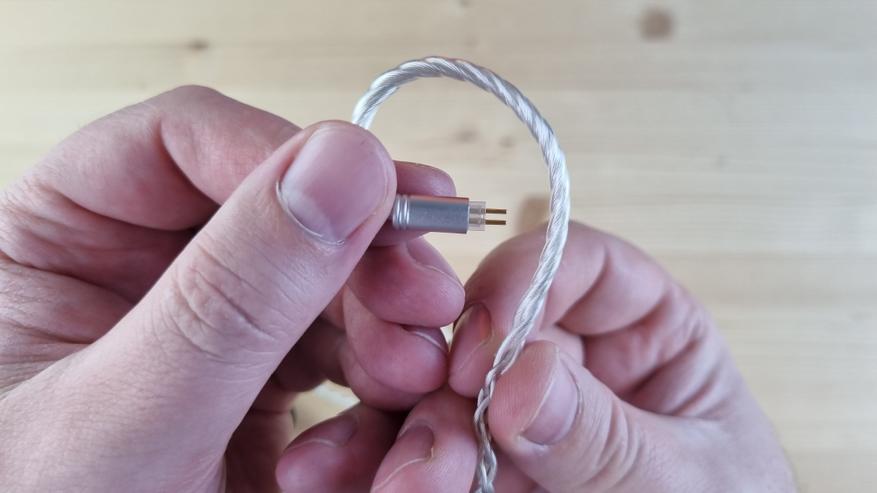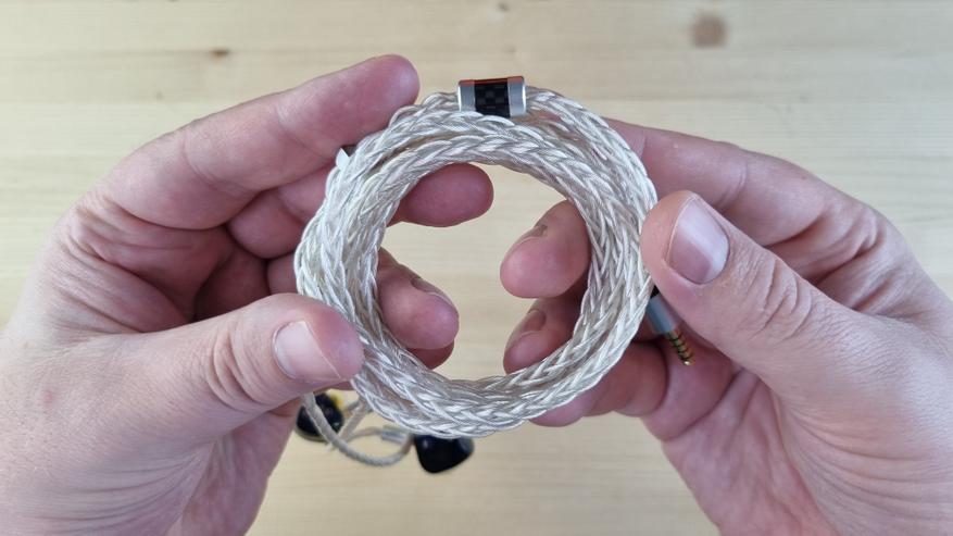 Кабель с виду нормальный, он гибкий, плетёный, сразу на 4.4 мм джек и с сопротивлением на каждой из жил примерно по 0.1 Ома. Это не что-то гениальное, но данной модели он действительно подходит.