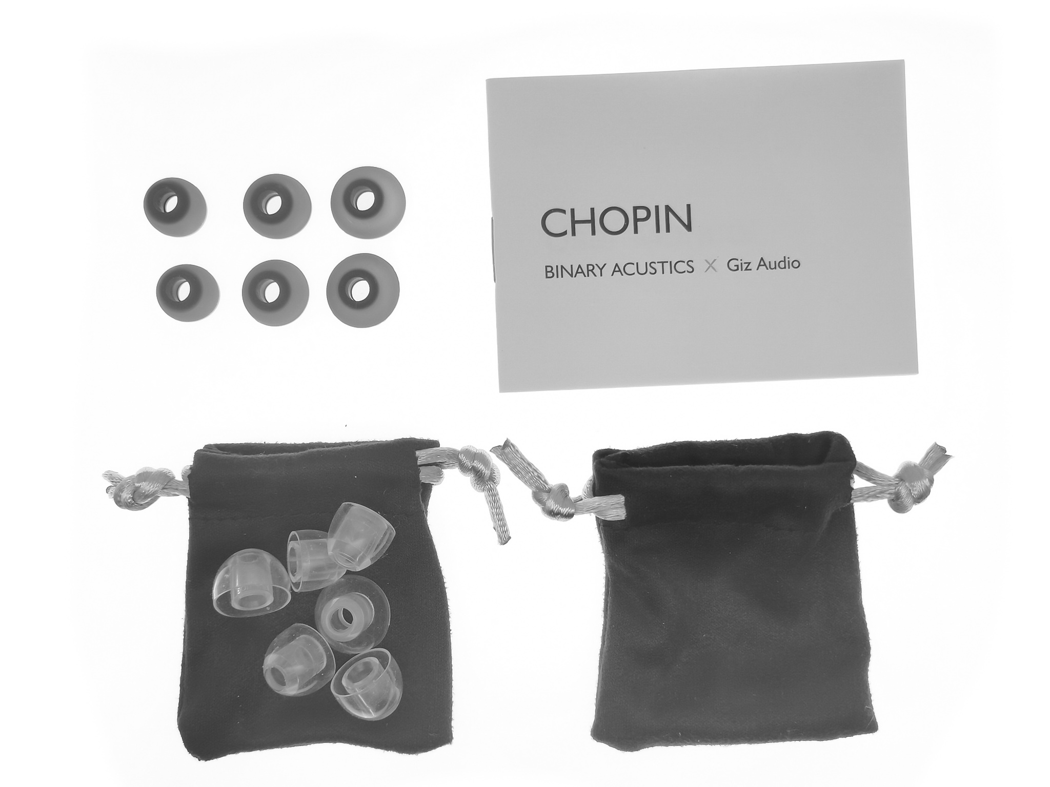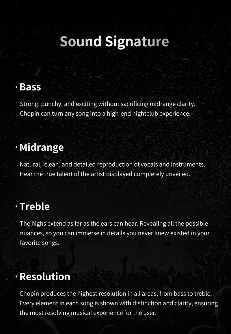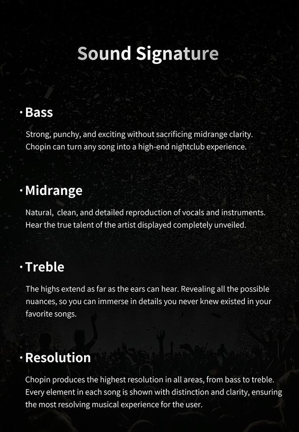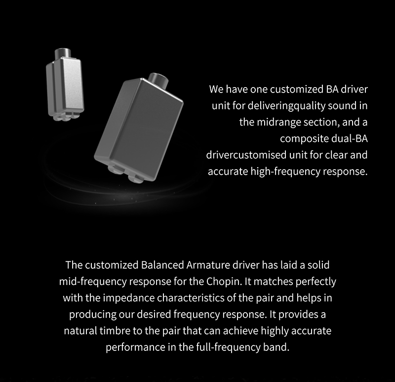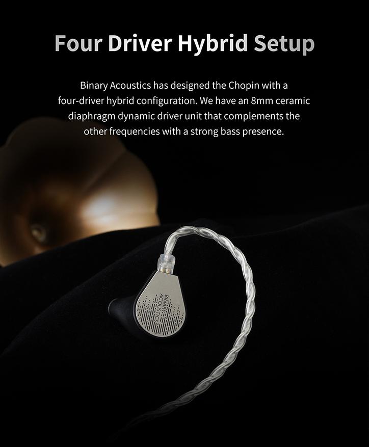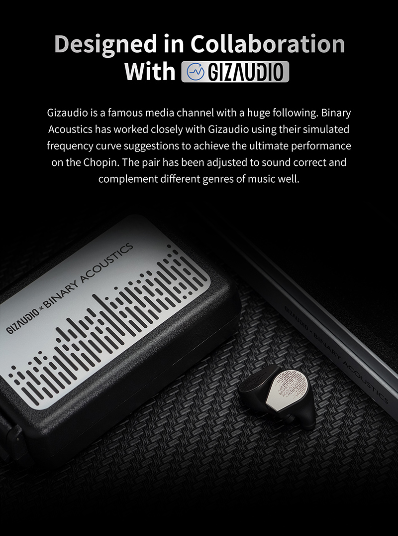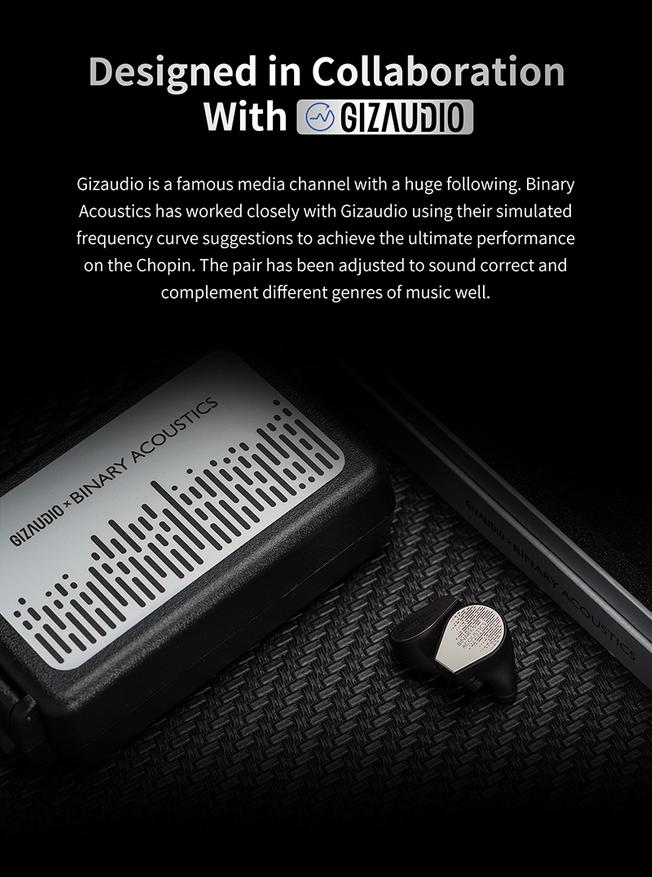 Chopin (Шопен) — это наушники от молодого аудио бренда Binary Acoustics, которые были разработаны совместно с Gizaudio (аудио блогер). Данные наушники являются четырёхдрайверными гибридами, обладающие ярким звучанием с подробными высокими частотами, выразительным женским вокалом и неплохим басом.