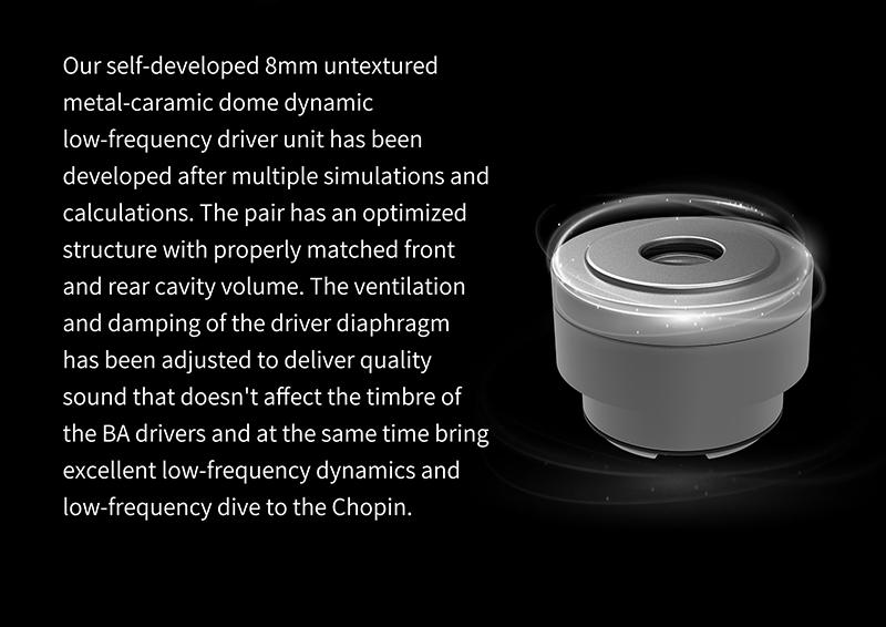 За звук Gizaudio x Binary Chopin отвечают четыре драйвера: динамический с 8mm керамической диафрагмой — для низких частот, арматурный — для средних частот, и сдвоенный арматурный — для высоких частот.