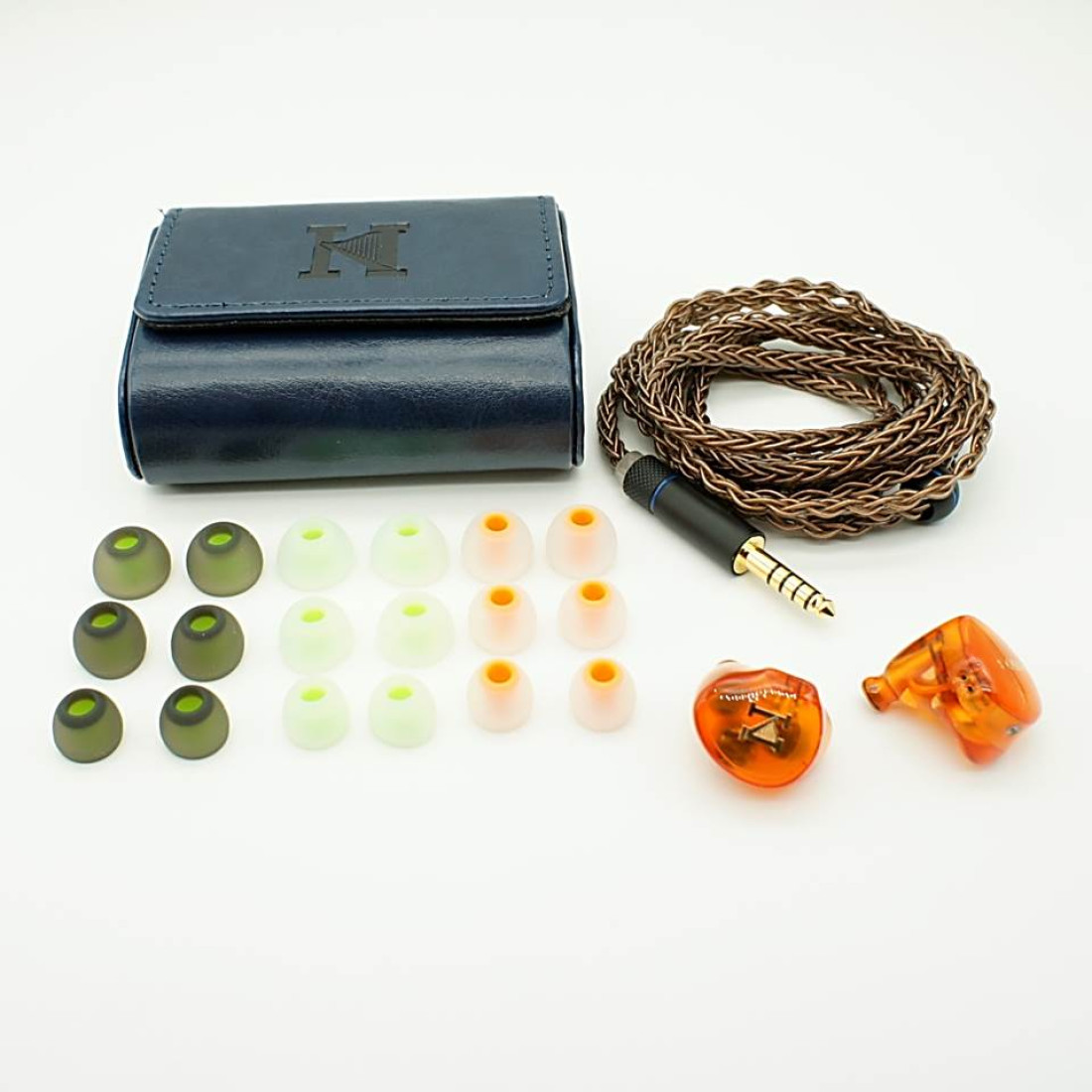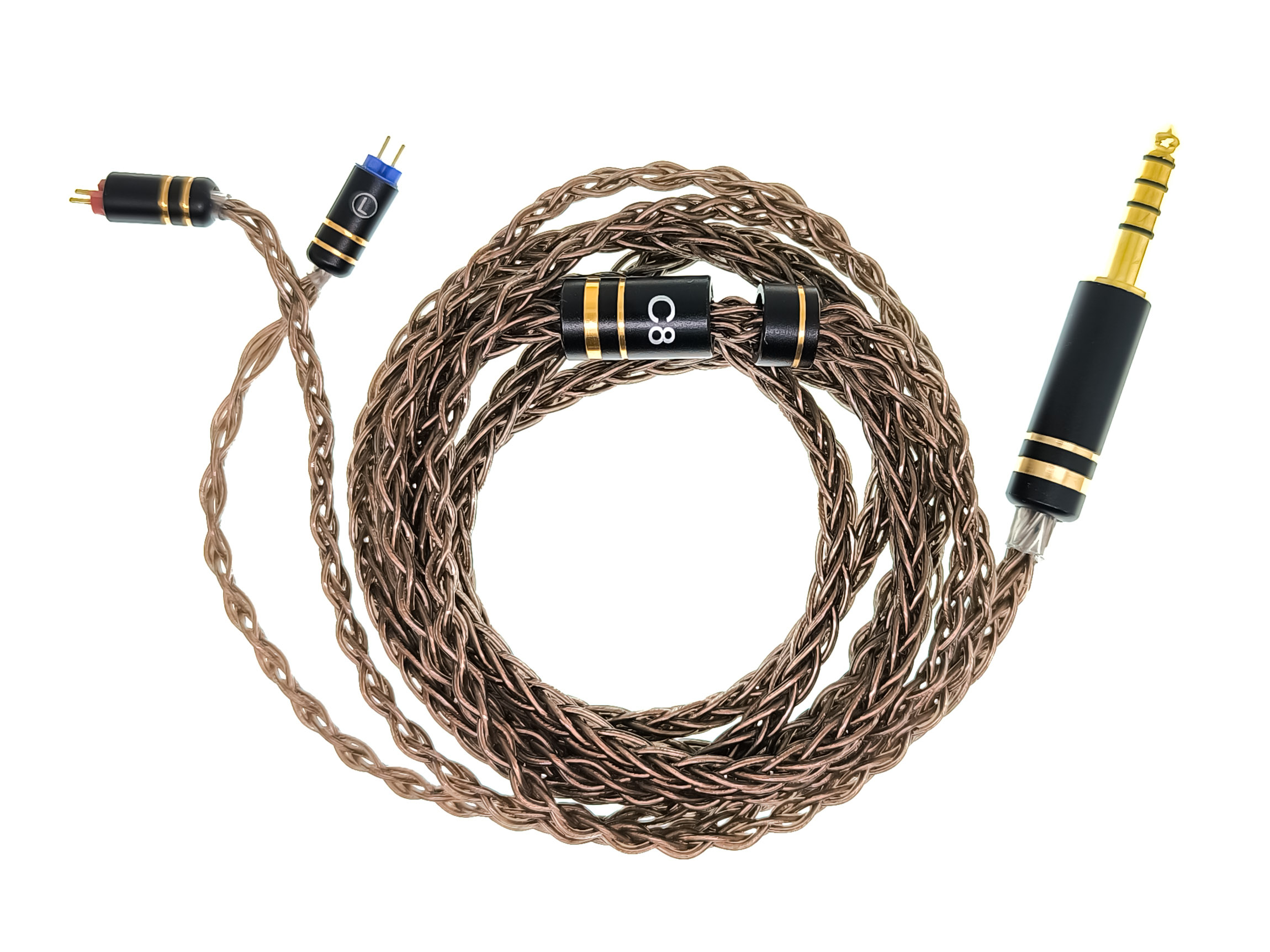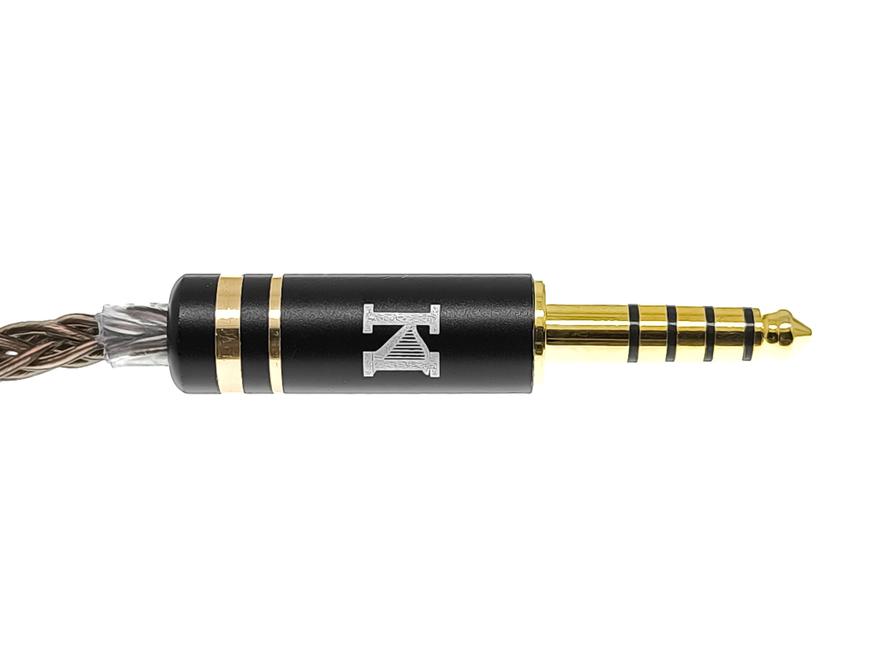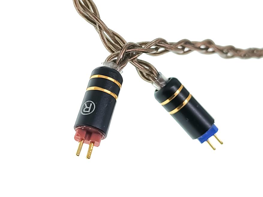 Кабель медный, восьмижильный, мягкий и гибкий, но так как его толщина довольно большая, то склонность к спутыванию незначительная. Фурнитура металлическая, черного цвета с декоративными золотыми кольцами. Слайдер, который стягивает два верхних провода, двигается легко. Заушины отсутствуют. Для подключения кабеля к наушникам используются стандартные двухпиновые коннекторы, с буквенной и цветной маркировкой каналов. Коннекторы поначалу вставляются в наушники очень туго, но через несколько переподключений разъемы разрабатываются, и становится нормально. Для подключения к источнику звука, при заказе наушников на выбор предлагается три типа штекеров: обычный 3.5 mm, балансный 2.5 mm и балансный 4.4 mm. Я заказал ISN Neo 3 с балансным штекером 4.4 mm.