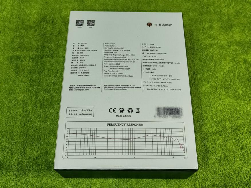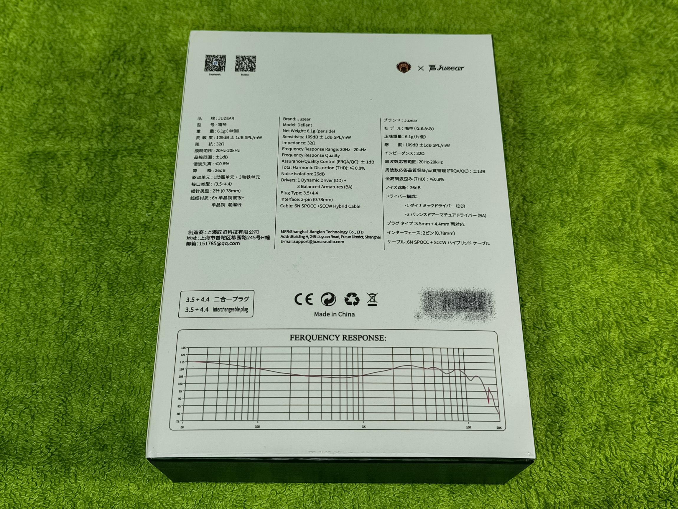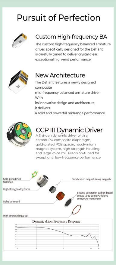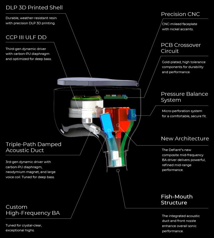 Juzear Defiant оснащены 10 миллиметровым динамическим драйвером с композитной полиуретановой диафрагмой и неодимовым магнитом, а так же тремя арматурными драйверами: два из которых отвечают за воспроизведение средних частот и один за высокие.