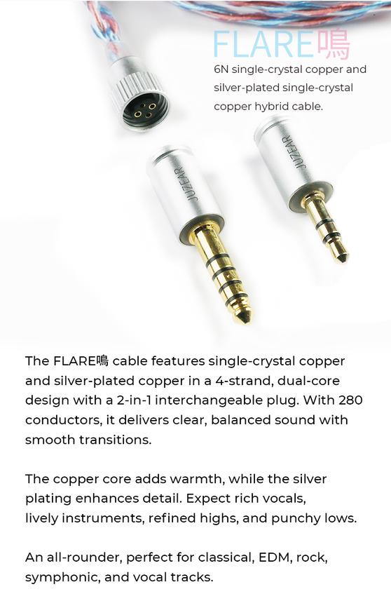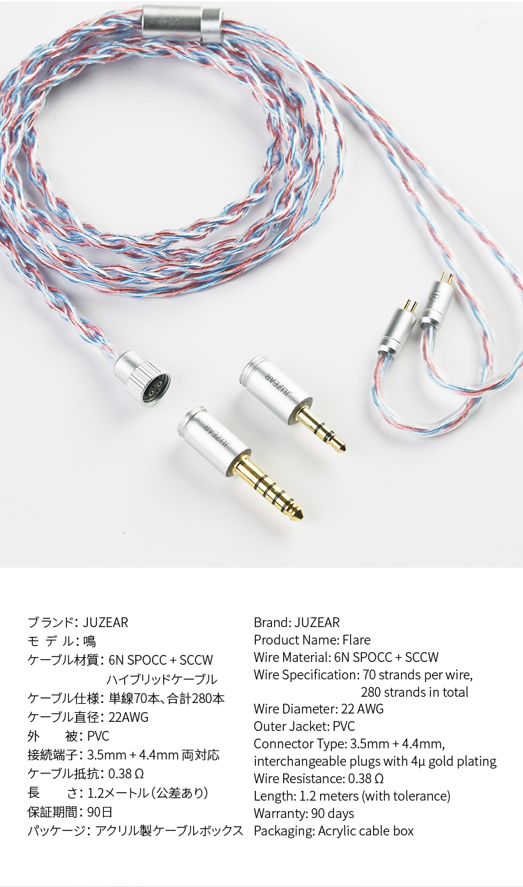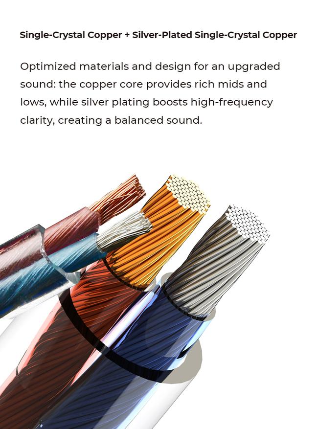 Наушники Juzear Defiant комплектуются фирменным 6N монокристаллическим, гибридным медным кабелем с «половинным» посеребрением. Кабель состоит из 4 жил, в каждой из которых 70 прядей (общее количество 280). Изоляция прозрачная, средней жесткости.