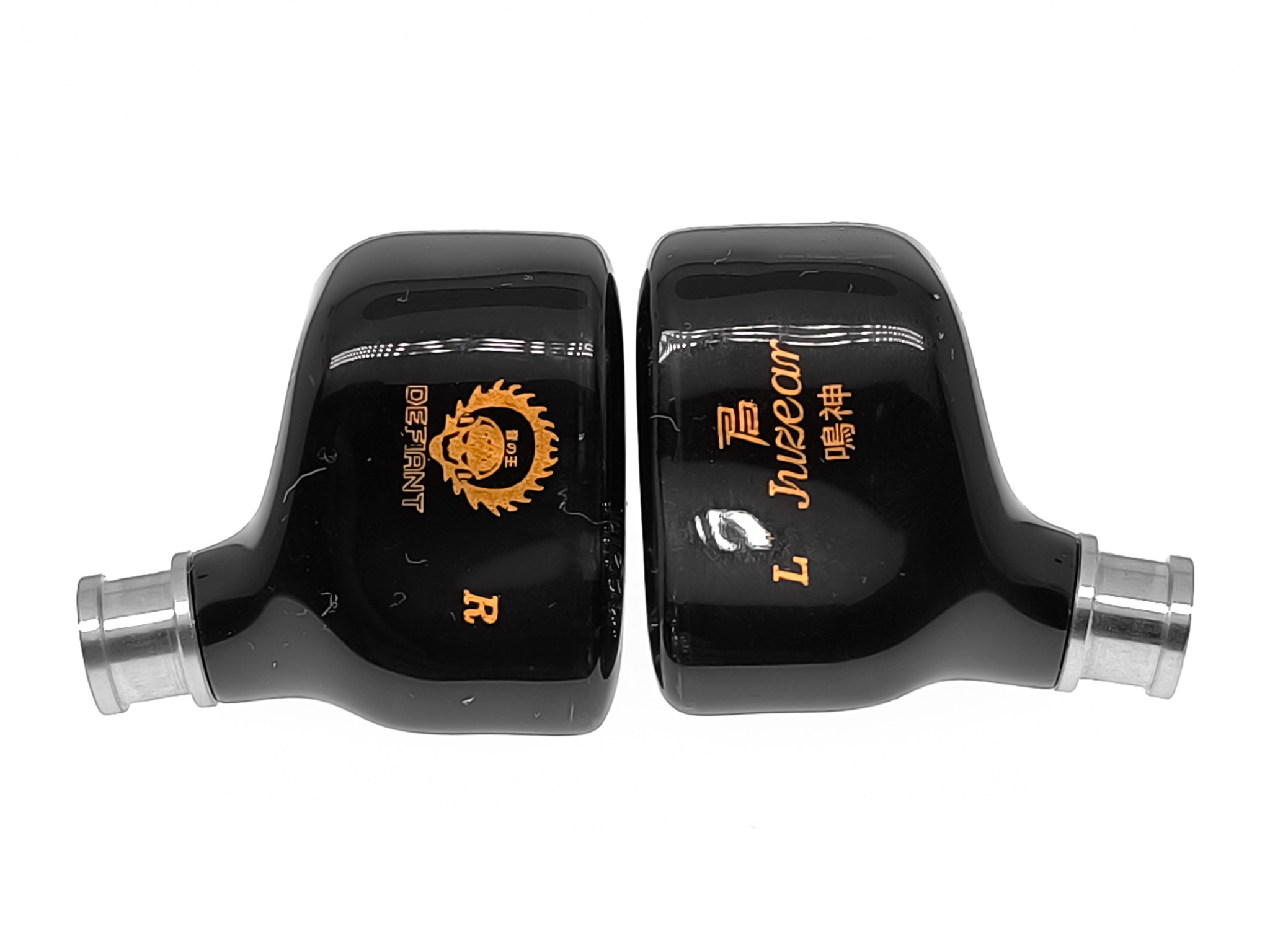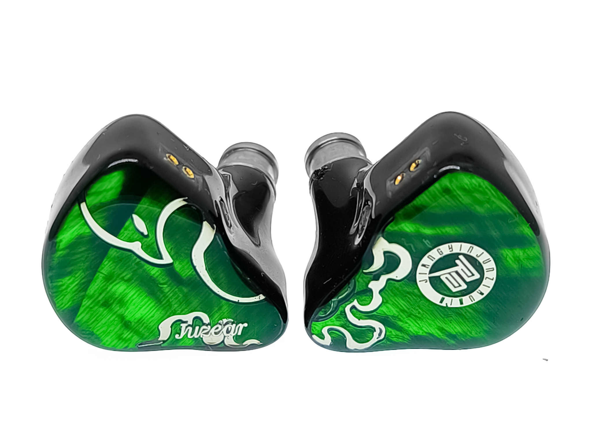 На нижней стороне наушников можно обнаружить маркировки каналов, а так же логотипы Juzear и блогера ZReview. Сверху наушников расположены компенсационные отверстия и двухпиновые разъемы для подключения кабеля. Звуководы металлические, диаметром 6.2 mm, и со стальной защитной сеткой.