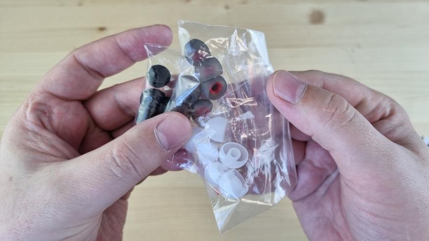 В комплекте была документация, простенький бокс и целых три набора самых дешевых силиконовых амбушюр. Вместо них я, естественно, использовал проверенные временем KB-07.