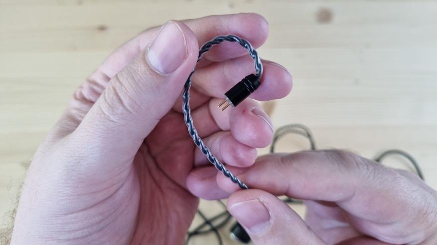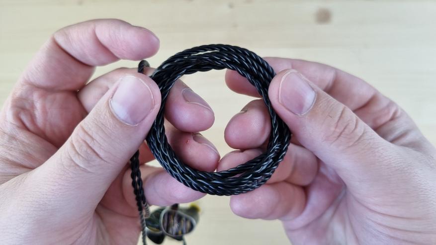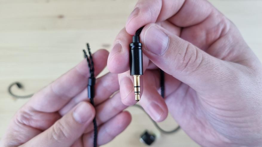 Кабель на вид тоже простой, он тонкий, гибкий, витой, с прямым штекером на 3.5 мм и с сопротивлением на каждой из жил по 0.46 Ома. На первое время он, наверное, сгодится, но лучше взять, например, графеновый от KbEar.