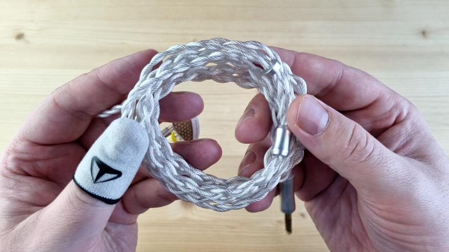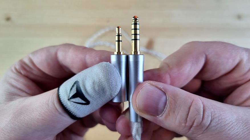 Кабель — толстый, гибкий, витой, со штекерами сразу на 3.5 и 4.4 мм и с сопротивлением по 0.16 Ома на каждой из жил. Неплохое решение — менять такой не нужно.