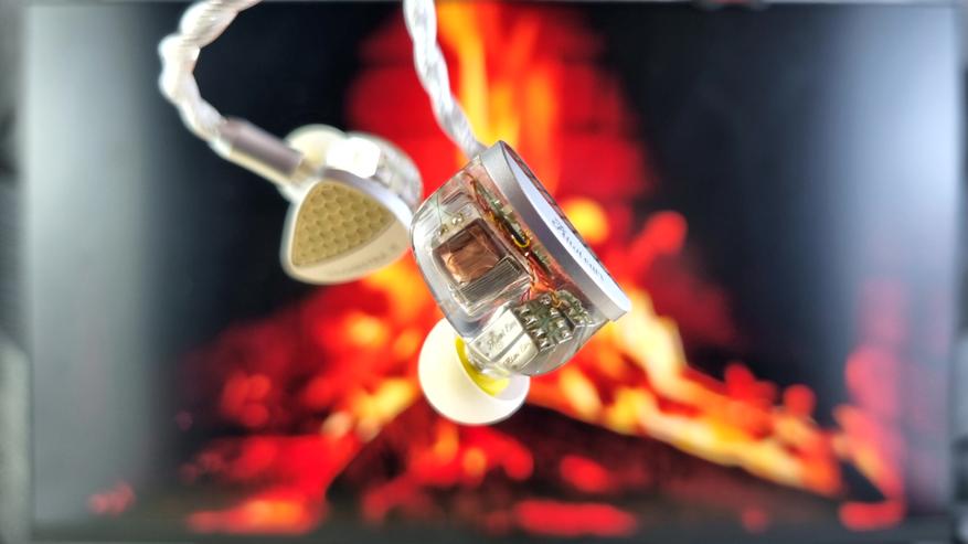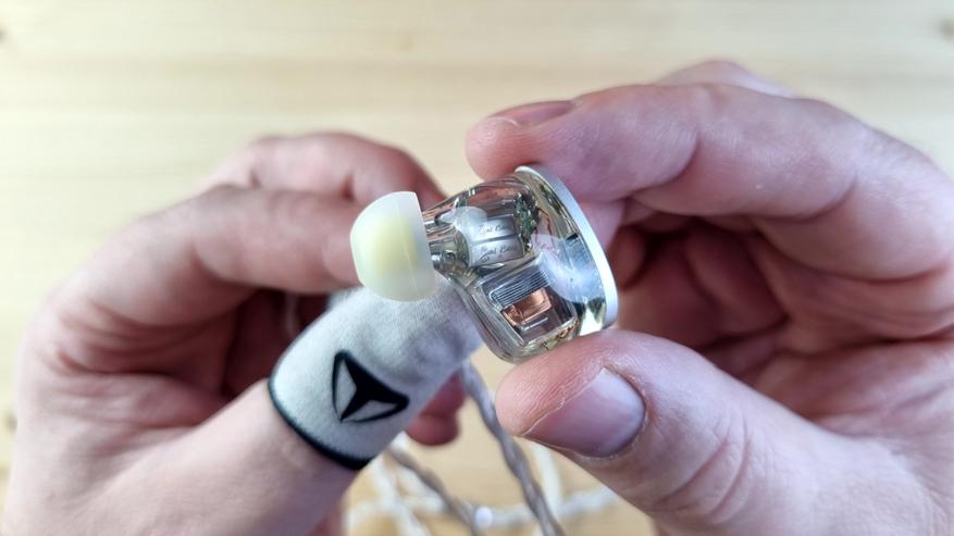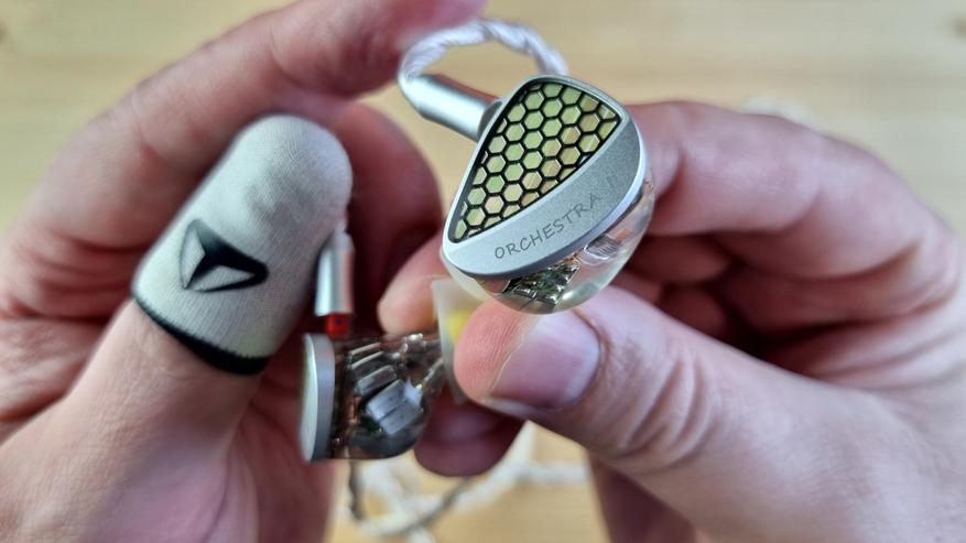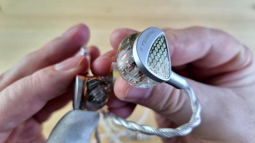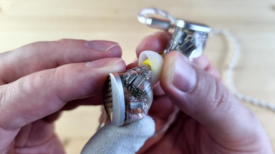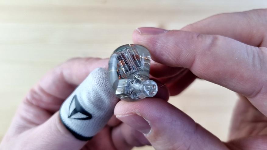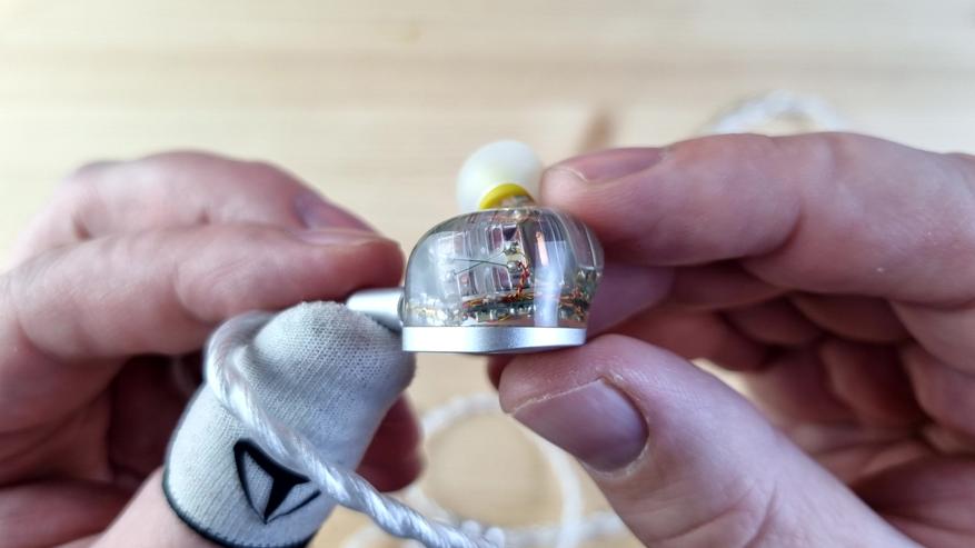 Чашечки из полностью прозрачной гипоаллергенной смолы, сквозь которую видна вся кухня модели: два внушительных вуфера, четыре среднечастотника, два высокочастотных арматурных излучателя и две пищалки. Звуковод сделан из того же материала, что и остальной корпус. Из нюансов — отсутствует отверстие для компенсации, ну, а с внешней стороны имеем текстуру пчелиных сот или схожую по виду абстракцию.