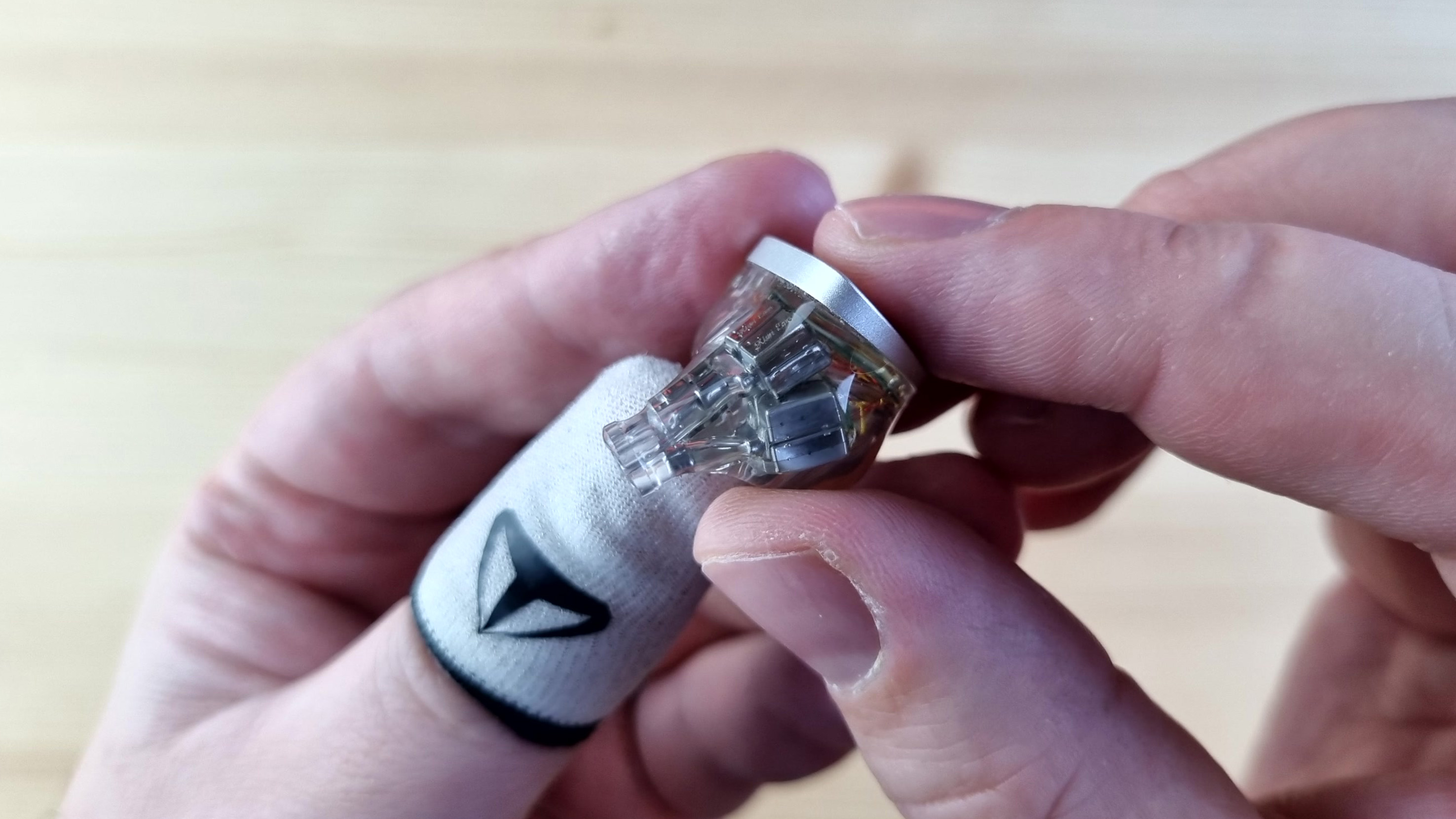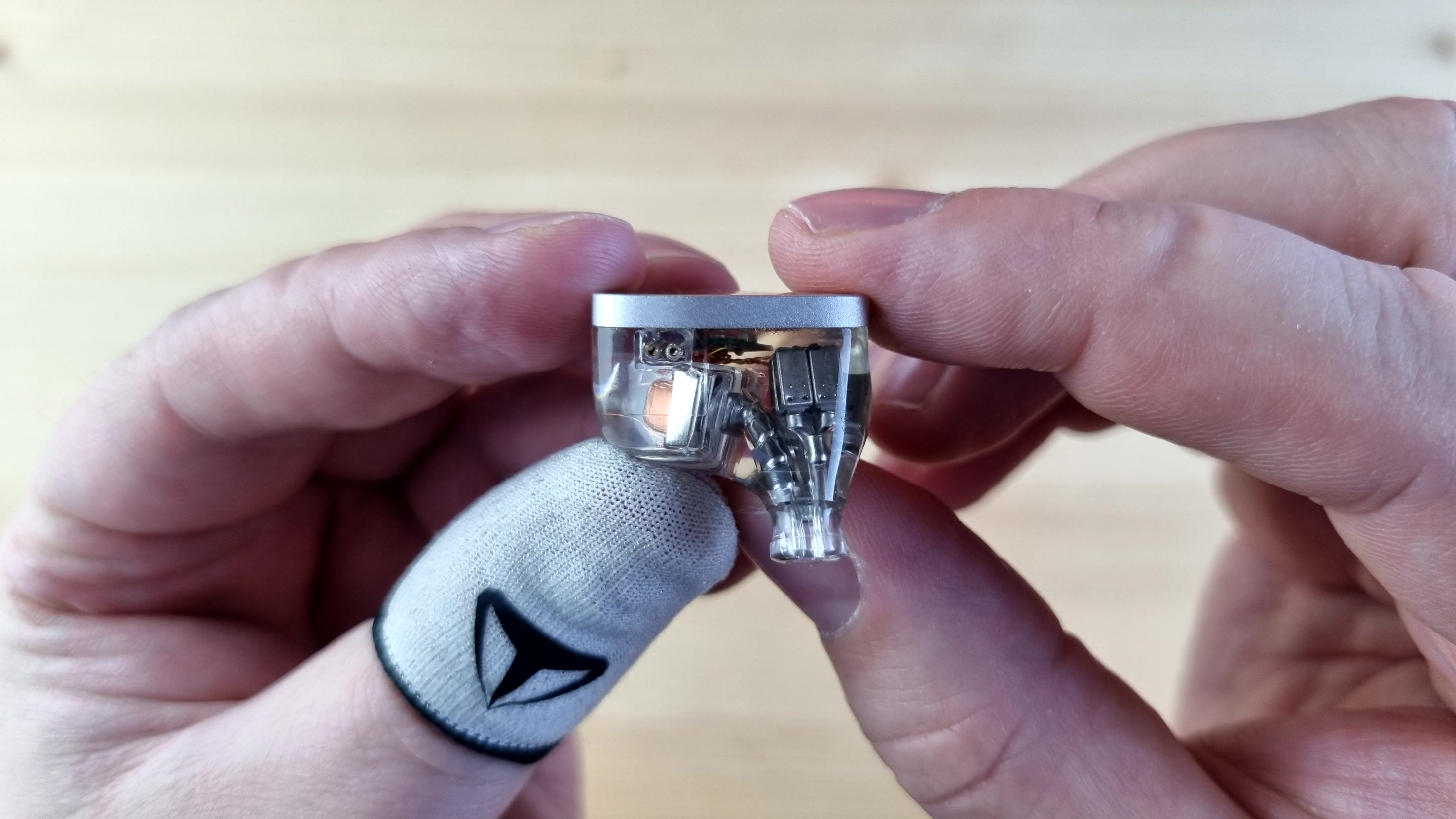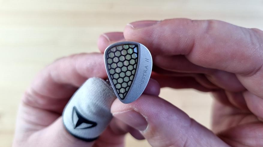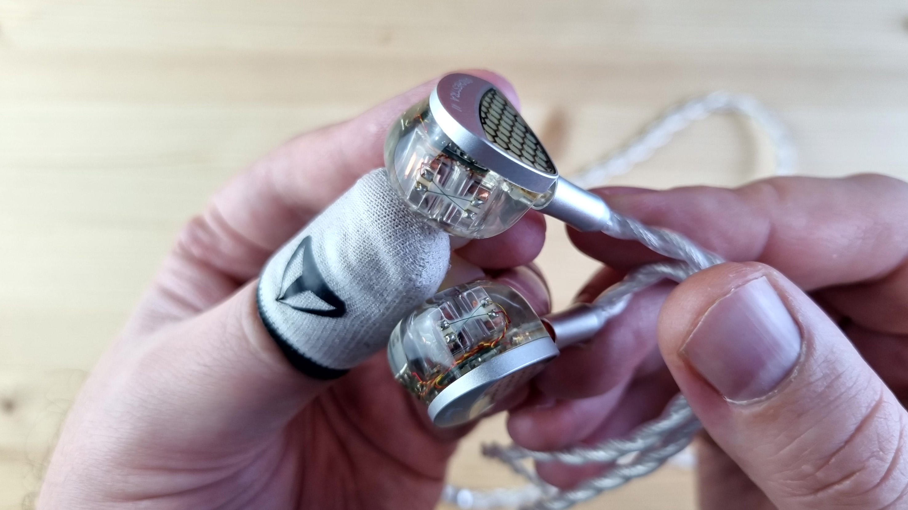 Чашечки из полностью прозрачной гипоаллергенной смолы, сквозь которую видна вся кухня модели: два внушительных вуфера, четыре среднечастотника, два высокочастотных арматурных излучателя и две пищалки. Звуковод сделан из того же материала, что и остальной корпус. Из нюансов — отсутствует отверстие для компенсации, ну, а с внешней стороны имеем текстуру пчелиных сот или схожую по виду абстракцию.