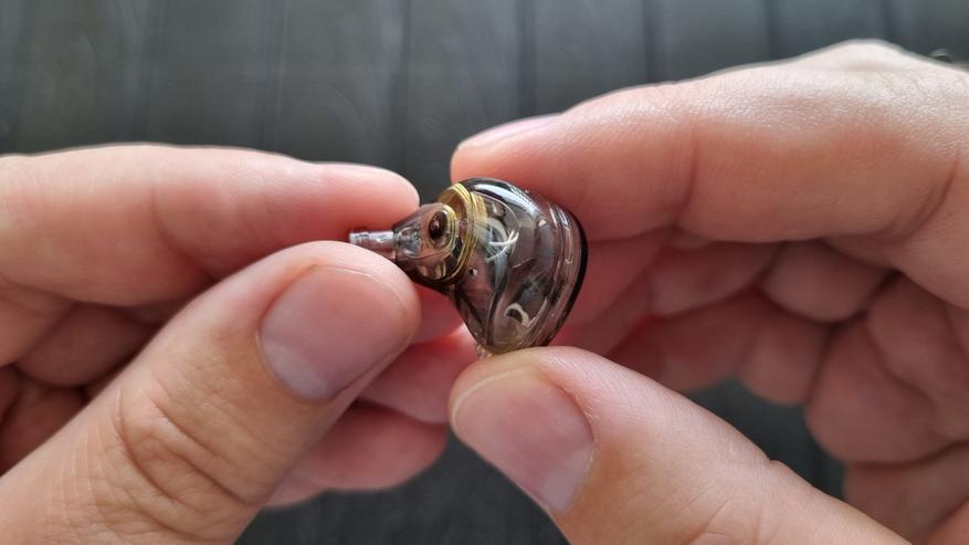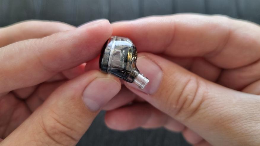 Чашечки здесь полностью пластиковые, что и неудивительно, при их то цене. Внутри виден заявленный нам излучатель, целых два компенсационных отверстия, сравнительно тонкий звуковод, а также ещё два отверстия под металлической сеточкой с внешней стороны.