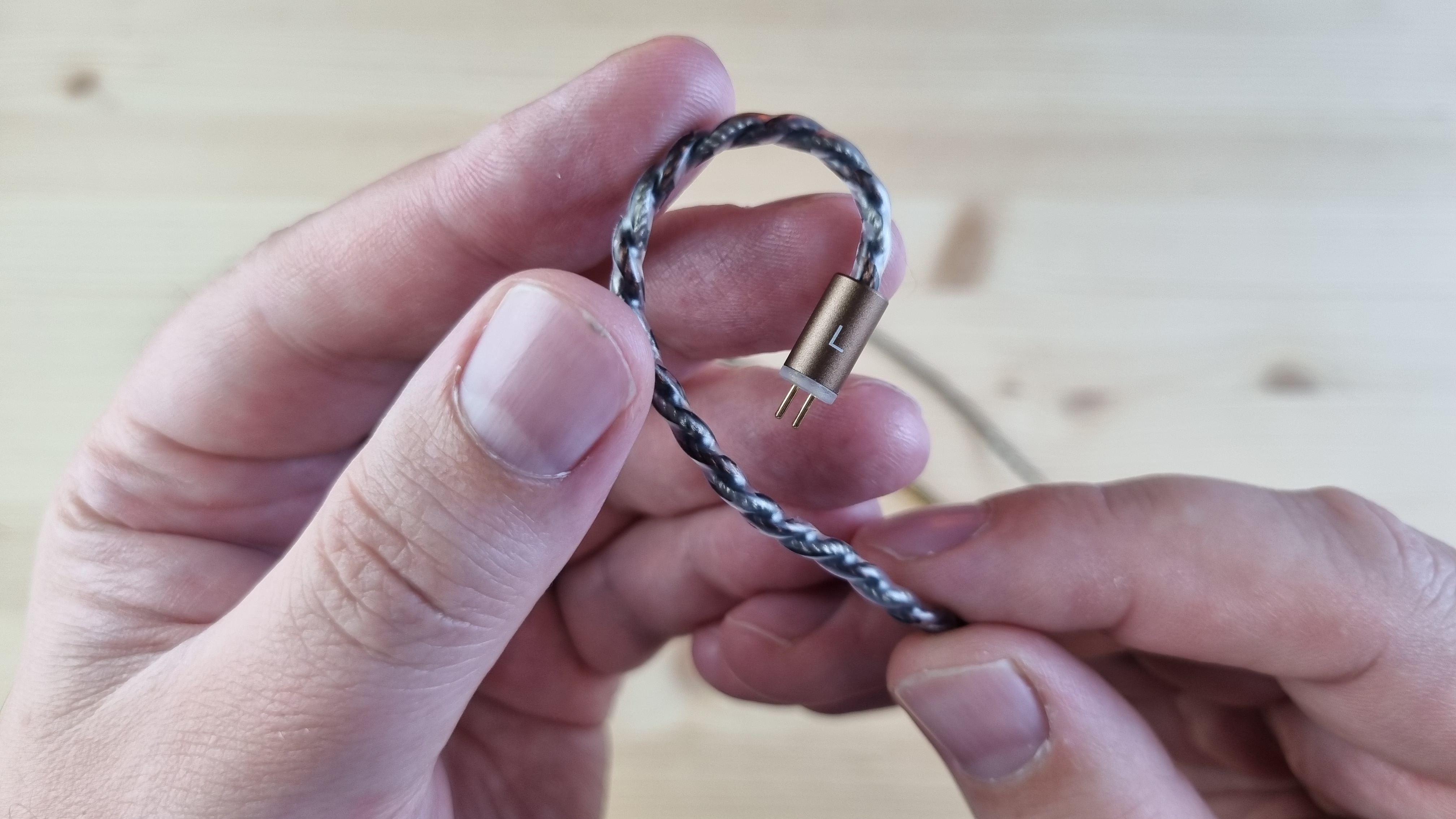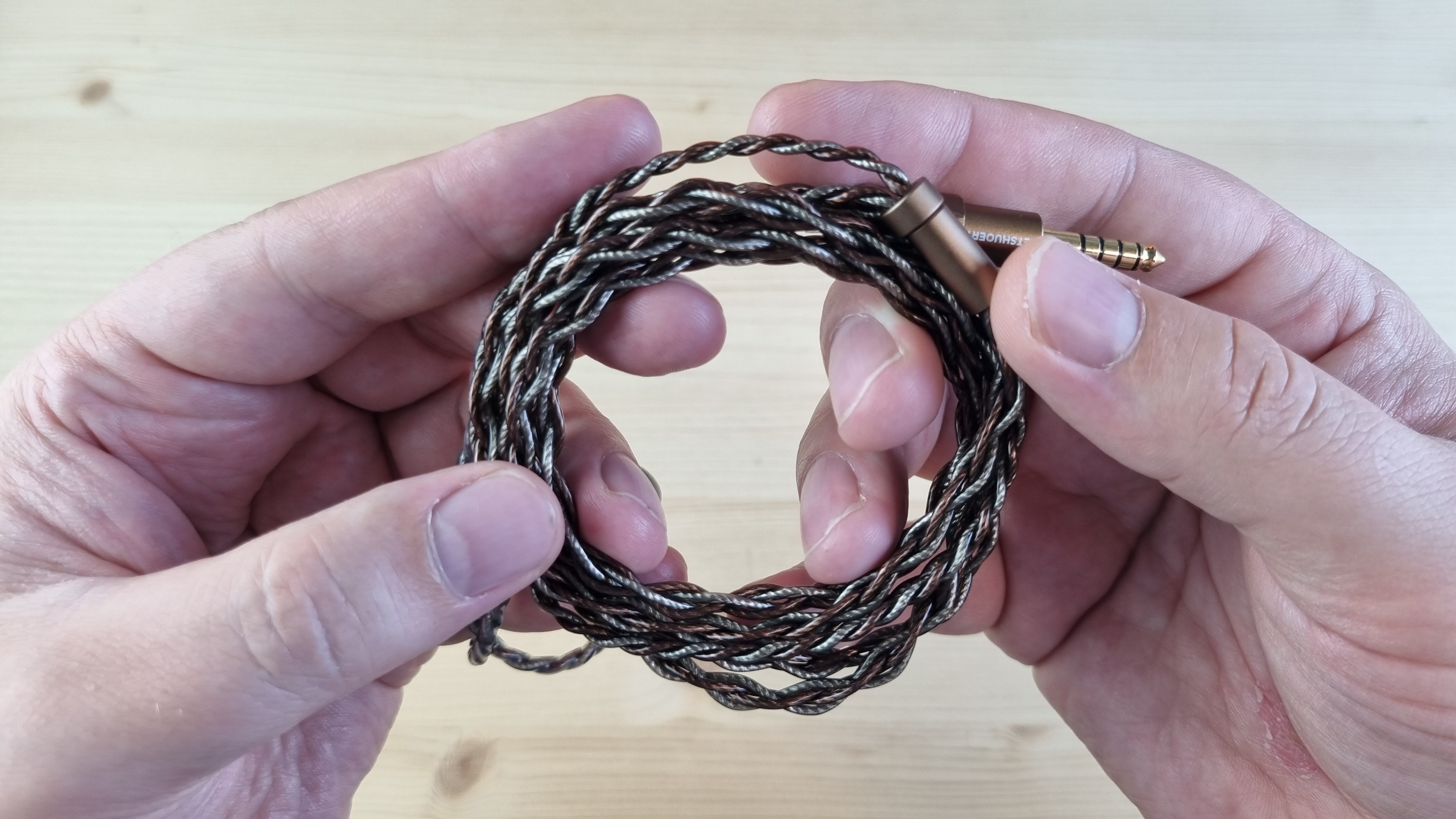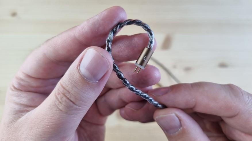 Кабель плотный, витой, с системой из сменных штекеров и сопротивлением на каждой из жил по 0.24 Ома. Рабочее решение — можно пользоваться.
