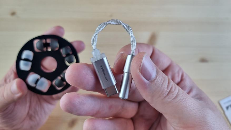 Внутри была документация, круглый бокс, два набора силиконовых амбушюр и простенький ЦАП на Type C разъеме. Чего-то особенного ждать от него не стоит, хотя на фоне встройки — это уже что-то интересное.