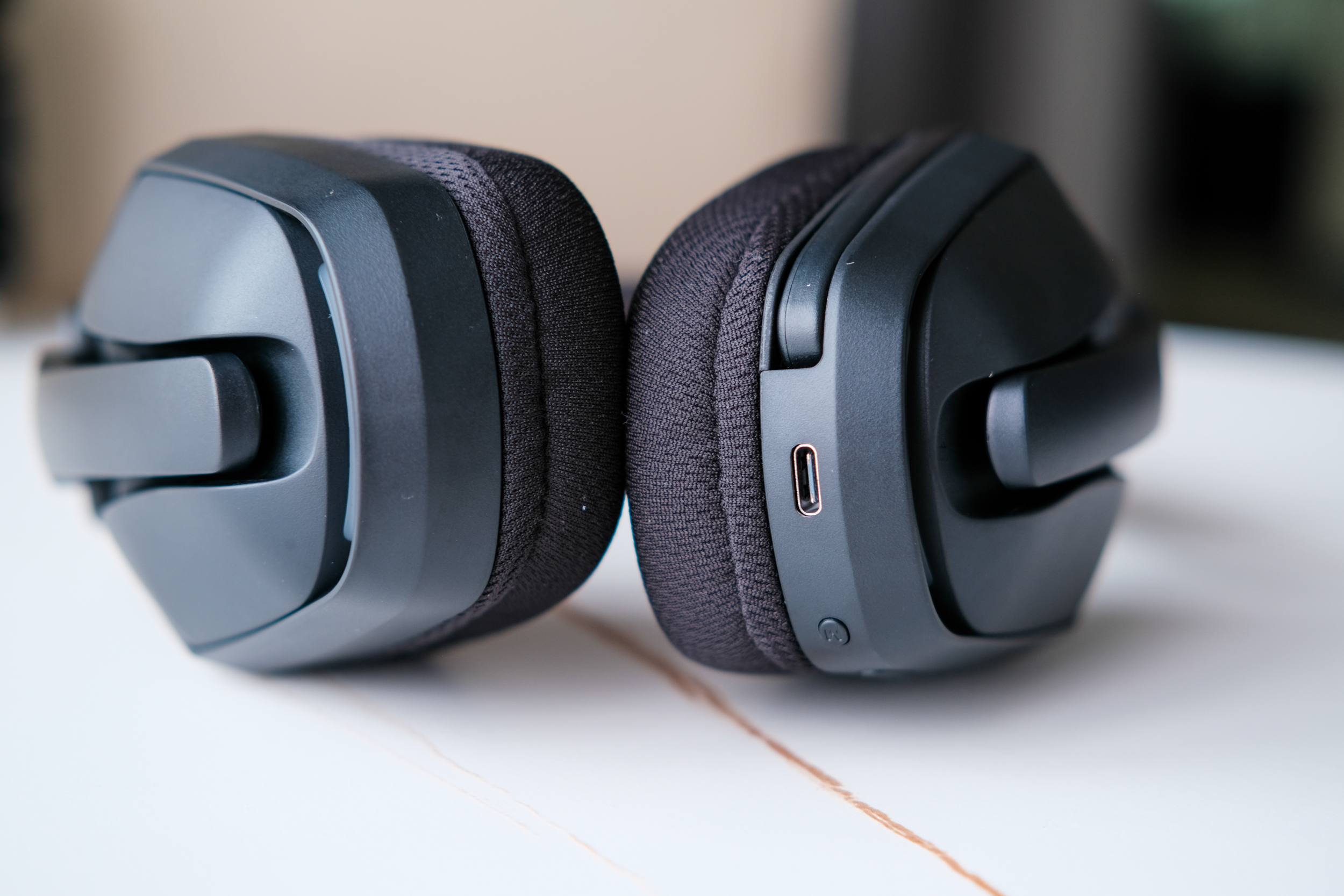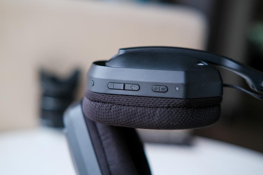 Для подключения по проводу и для подазрядки, на правом наушнике имеется порт type-C. Там же находятся кнопки. Их не так много, но все основные есть: кнопка включения, переключение режимов, кнопка отключения микрофона и кнопки громкости. Рядом с кнопками есть небольшой светодиод, показывающий статус работы. Правда его видно только когда наушники не на голове