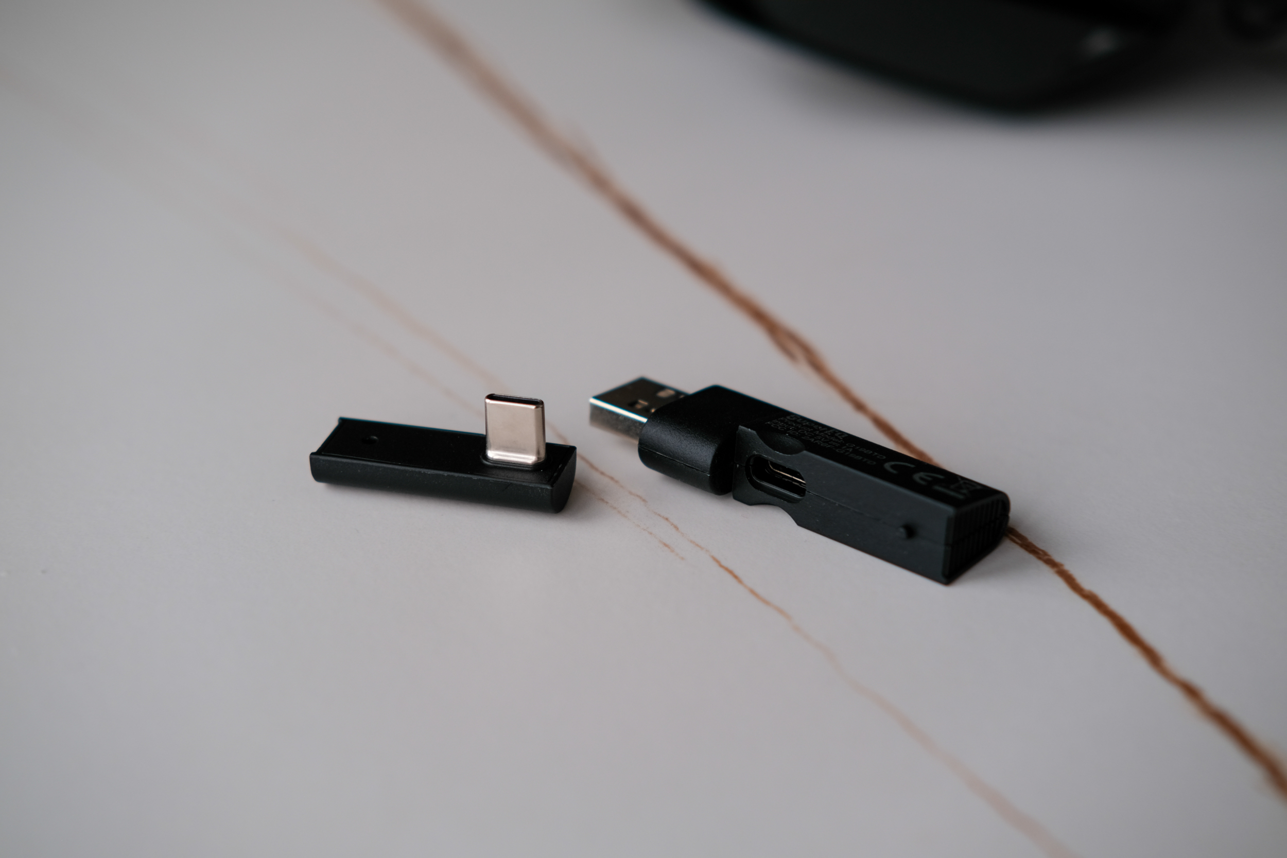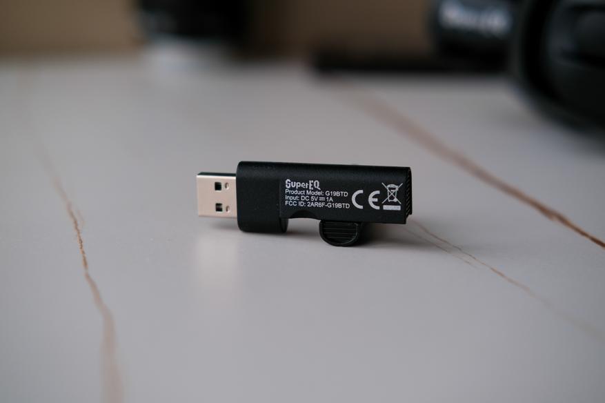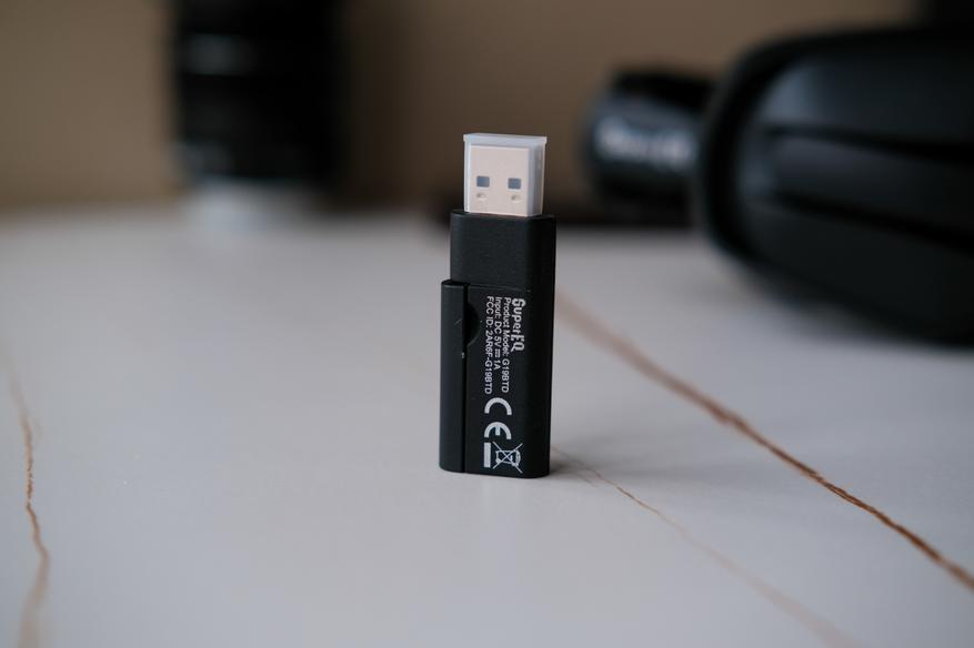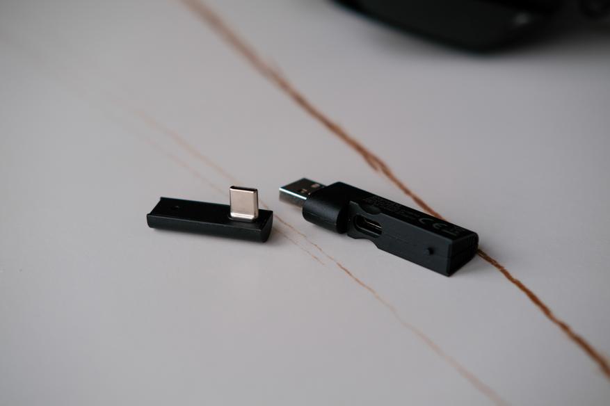 Отдельно покажу беспроводной адаптер. К тому же он сделан достаточно оригинально. Перед нами типа флэшка, которая разделяется на две половинки. Сам адаптер в той что поменьше и с Type-C