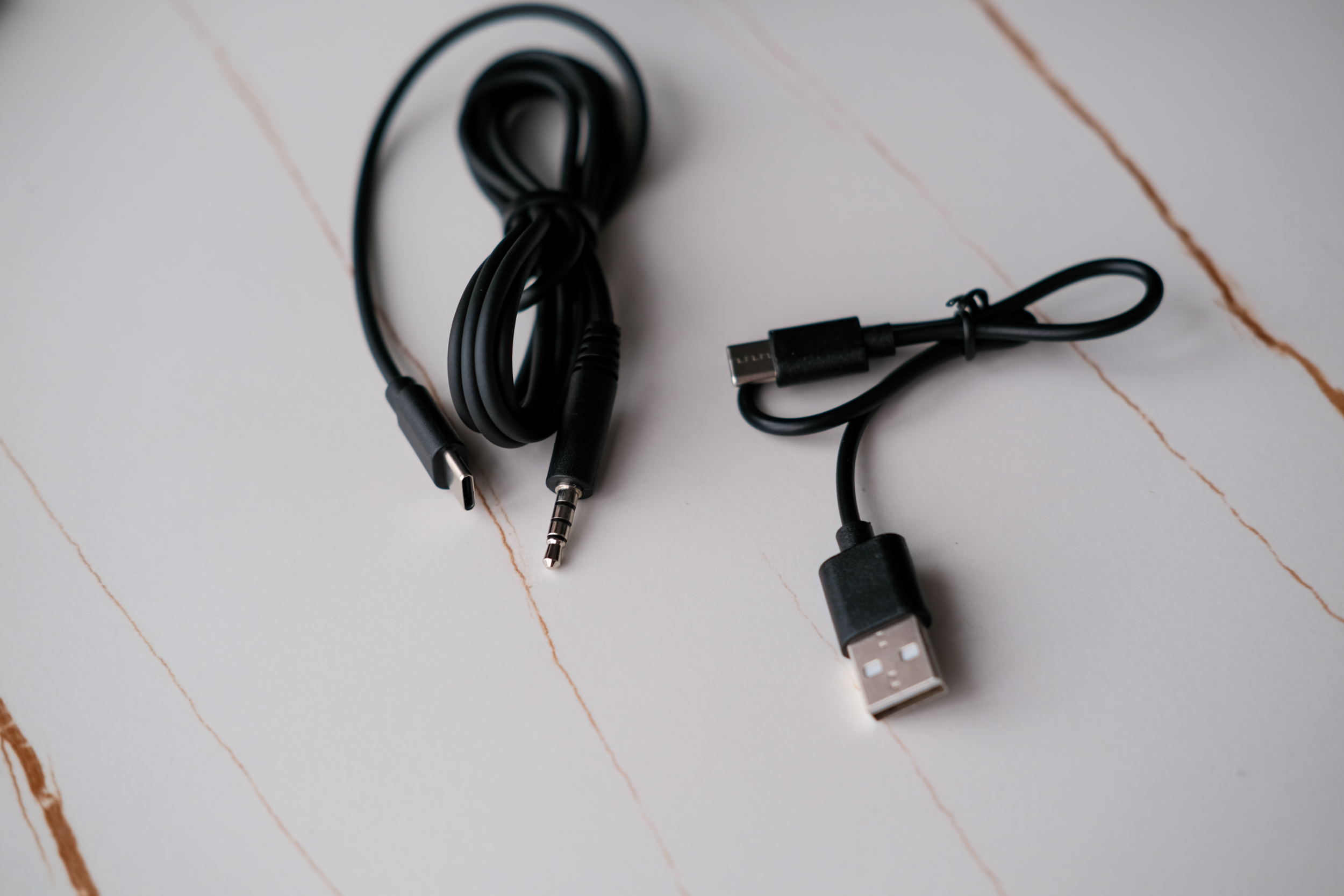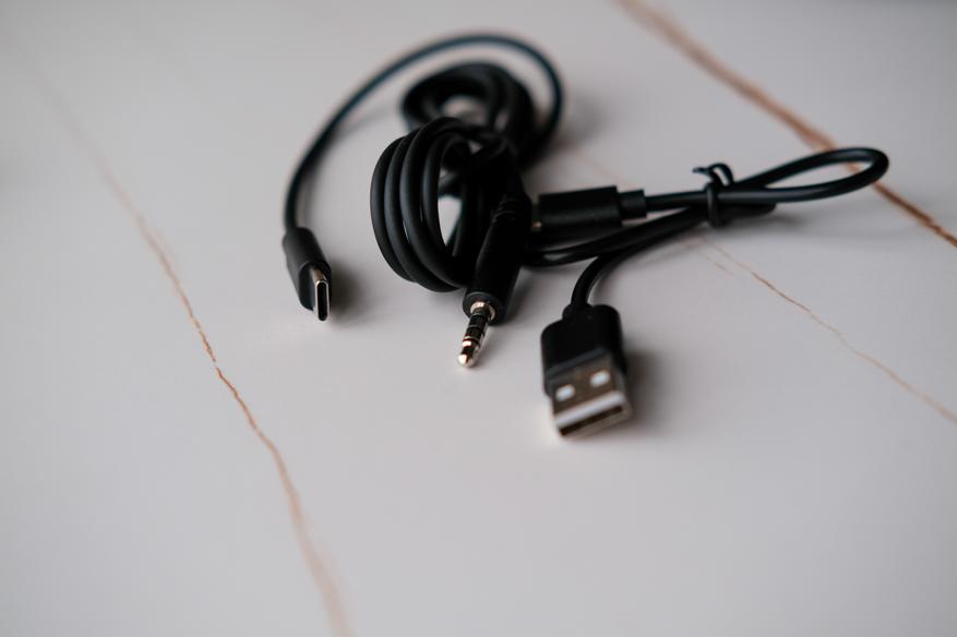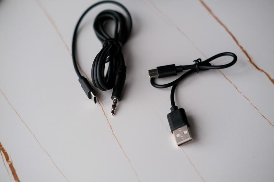 А вот шнуры тут разные не просто так. Первый шнур это обычный USB A на Type-C для подзарядки, а второй Type-C на AUX 3.5mm для проводного подключения