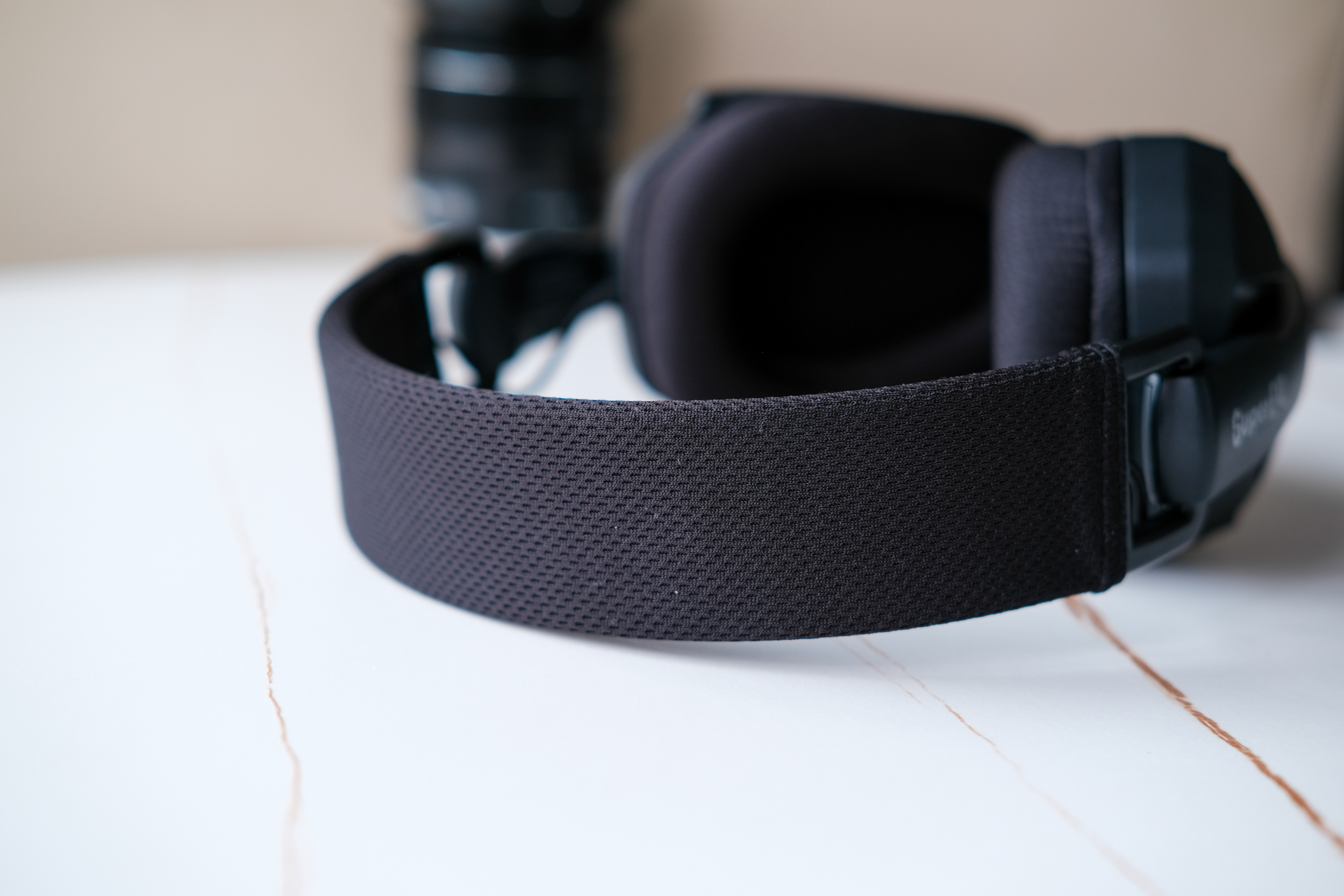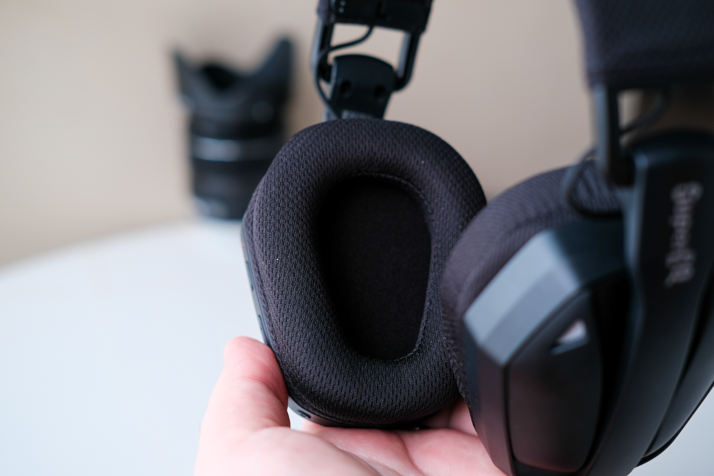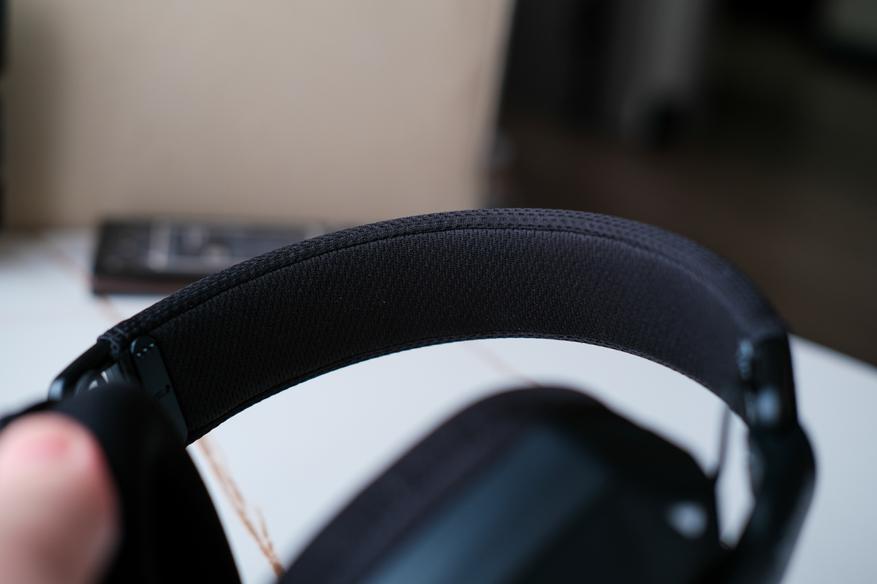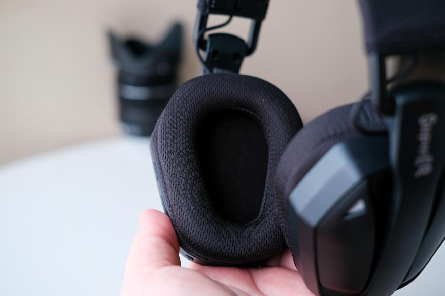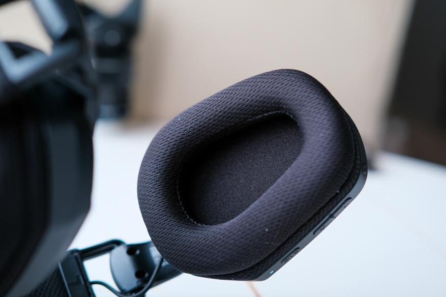 Амбушюры также достаточно мягкие, удобные. Кстати они тканевые, и уши в них не так сильно потеют. Внутри динамики прикрыты поролоном. И на ушах всё это сидит достаточно комфортно.