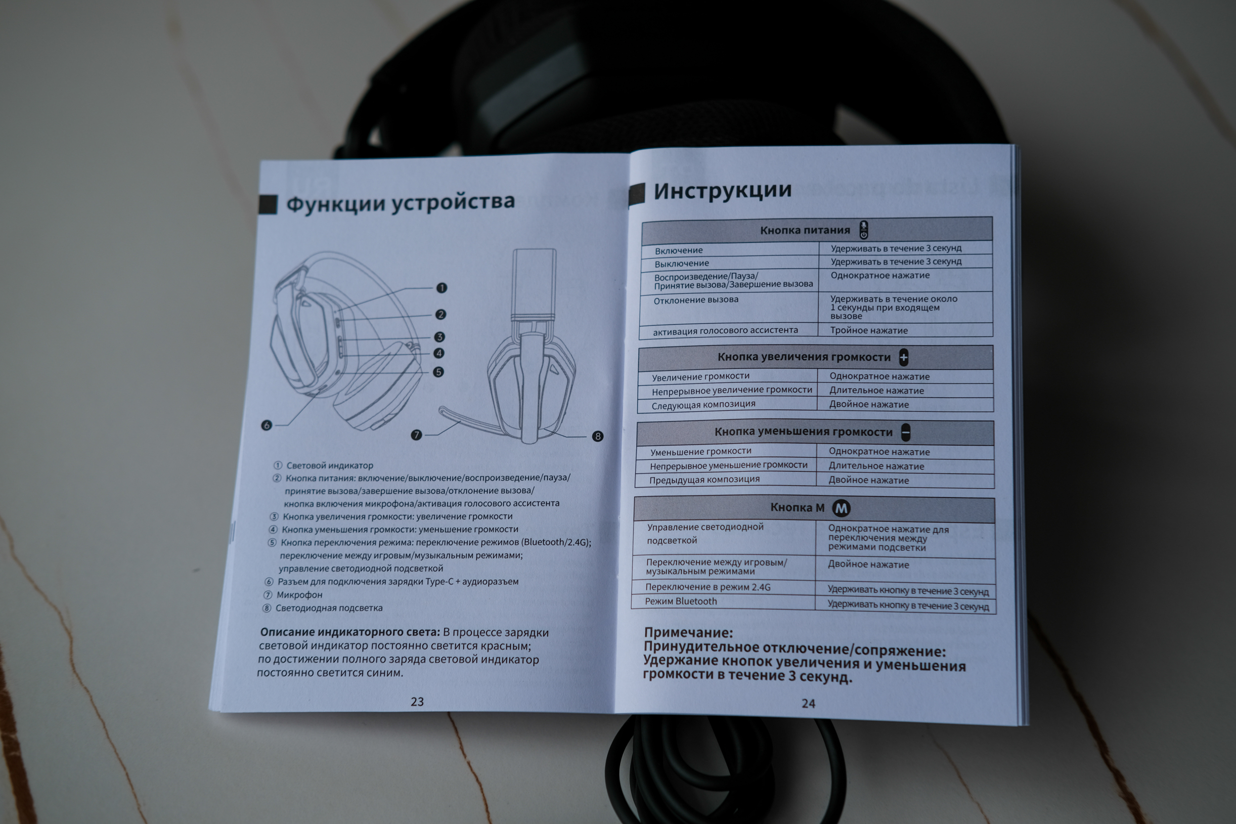 Инструкция кстати имеет много языков, в том числе и русский. Причём в неё даже полезно заглянуть, чтобы понимать как управлять кнопками на наушниках и как переключать режимы.