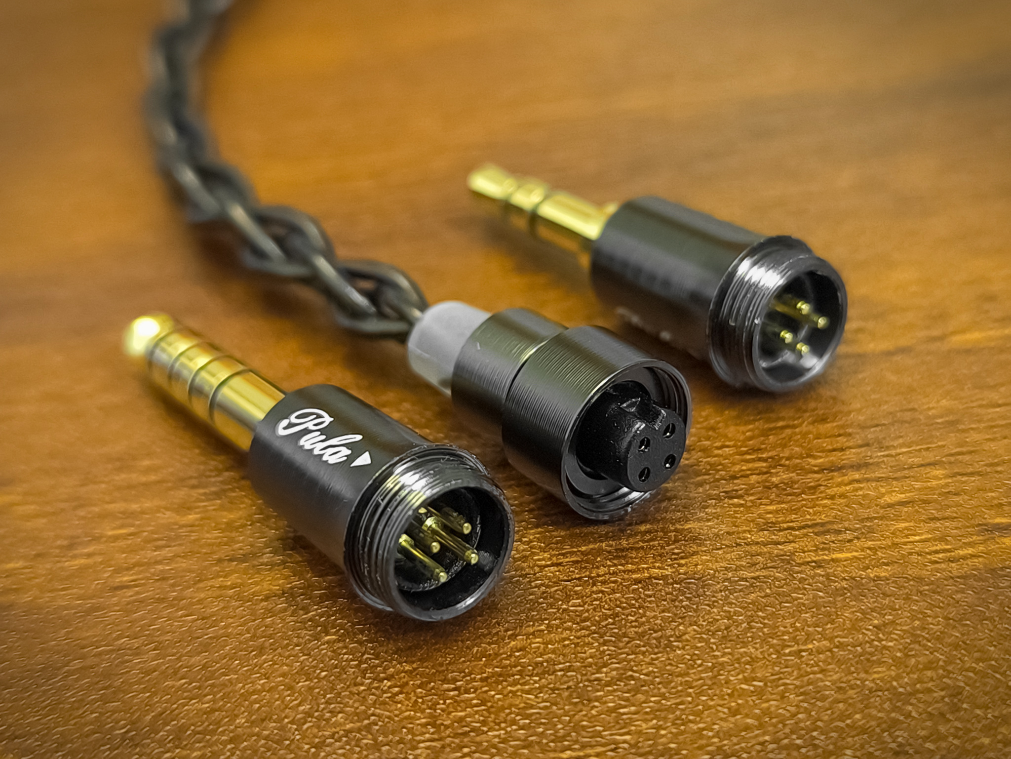Кабель Pula Audio Unicrom является модульным — со сменными штекерами. В комплектации с наушниками поставляется два штекера: балансный 4.4 mm — для подключения к специализированным аудиоустройствам (плеер, ЦАП, и.т.д), и обычный 3.5 mm — для подключения к остальным устройствам (ноутбук, телефон, и.т.д). Для замены штекера нужно открутить резьбовой фиксатор, выдернуть штекер, вставить на его место другой (проследив при этом что бы при подключении штекера совпали: выемка на кабеле возле контактов и выступ на штекере возле контактов), и закрутить резьбовой фиксатор обратно.