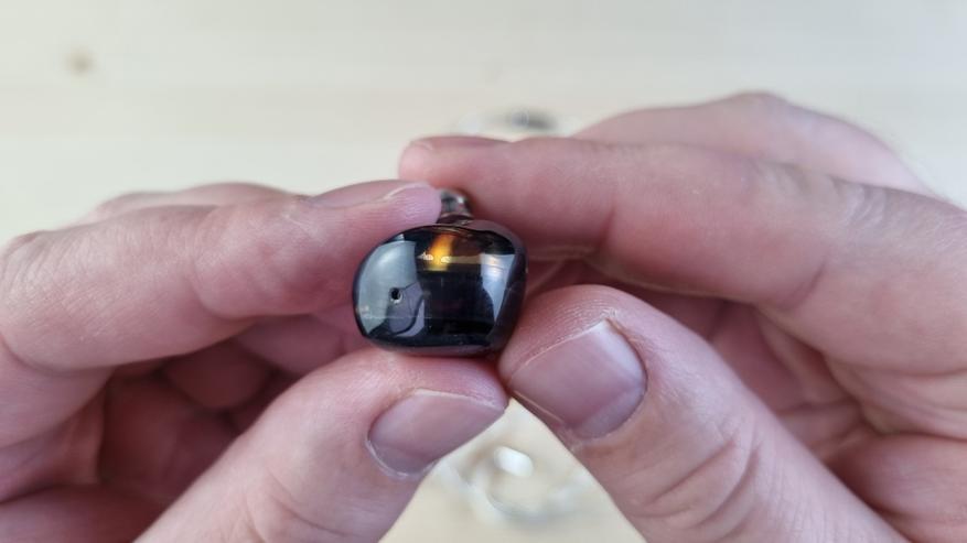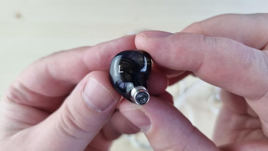 Чашечки по габаритам небольшие, сделаны из полупрозрачной смолы, с довольно вытянутым звуководом, компенсационным отверстием направленным назад, сеточкой-ромашкой и в холодных тонах оформленной внешней частью.