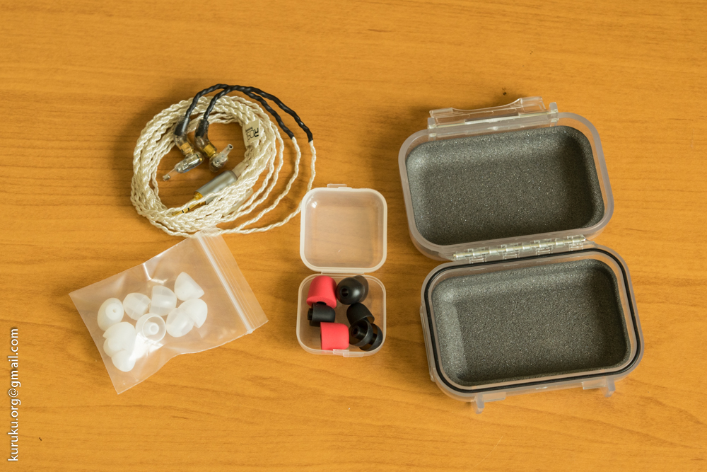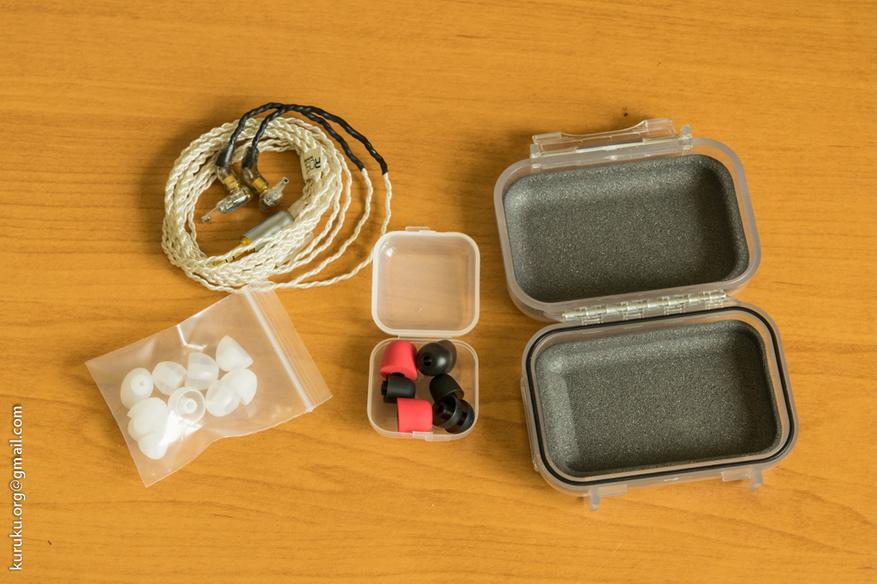 В комплект входят наушники, пластиковый кейс и куча всевозможных насадок.