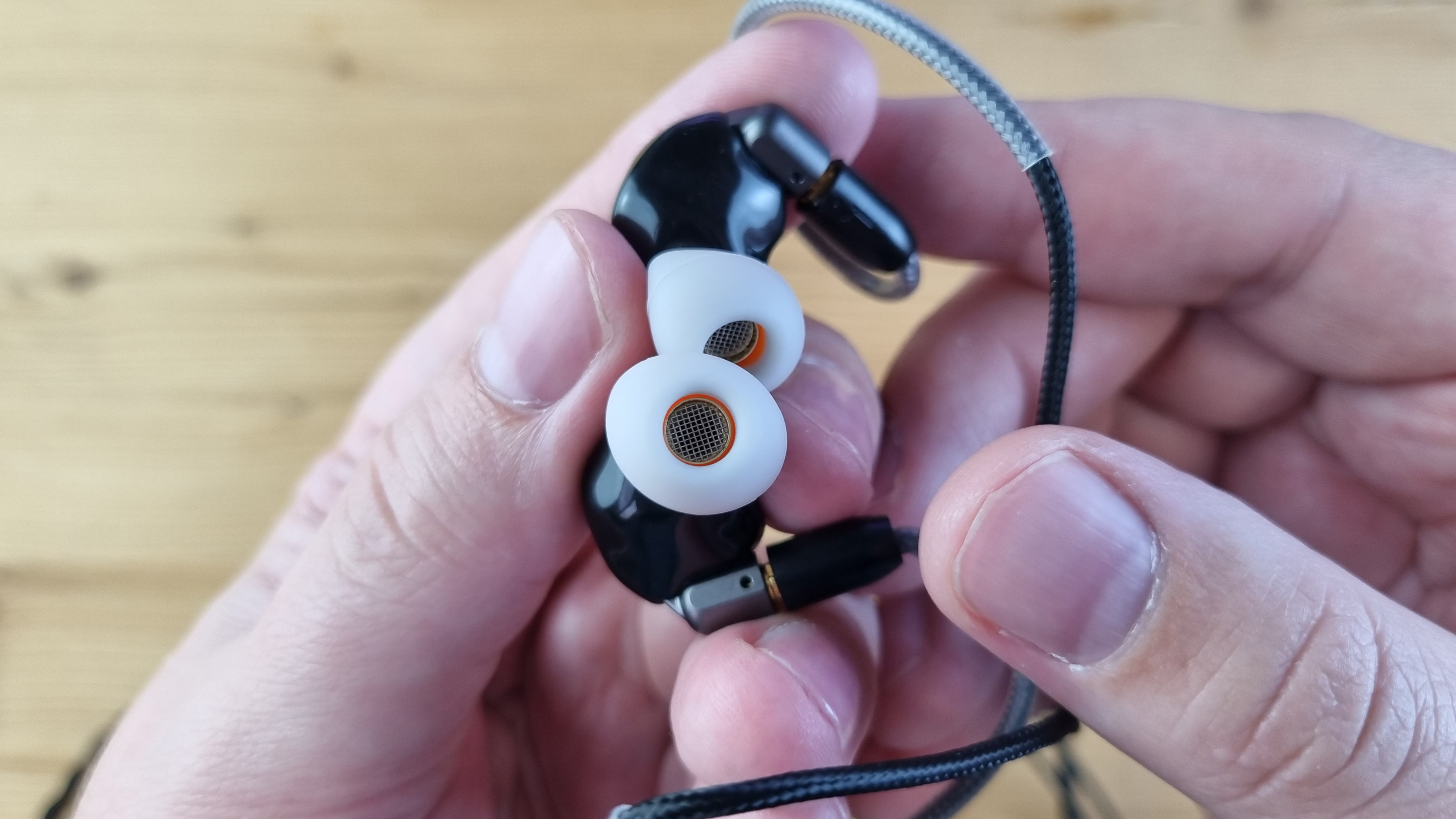 В комплекте шла документация, плотный круглый бокс, простенький мобильный ЦАП на 3.5 мм разъеме и два набора силиконовых амбушюр, в том числе и фирменные с оранжевым сердечником.