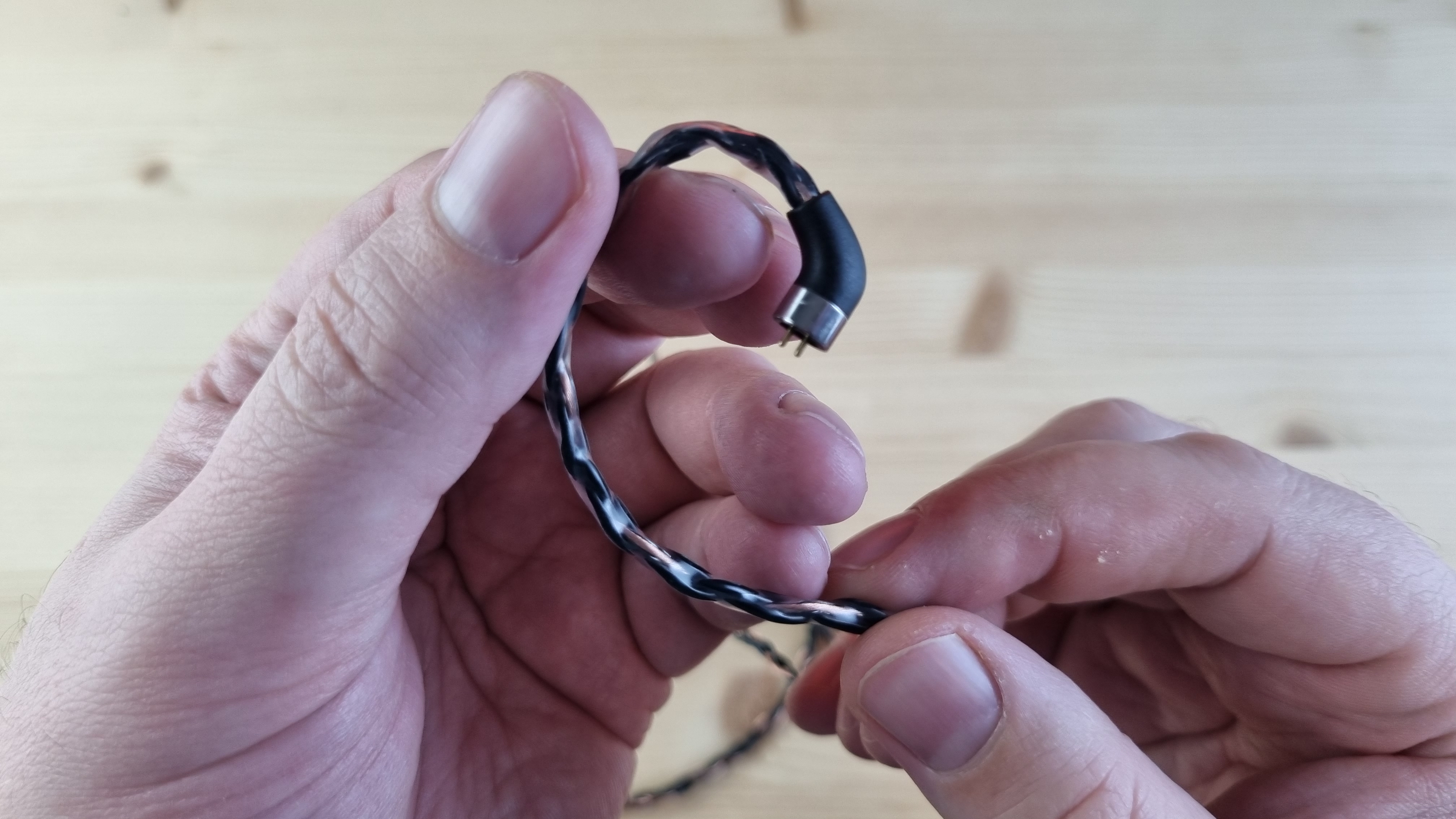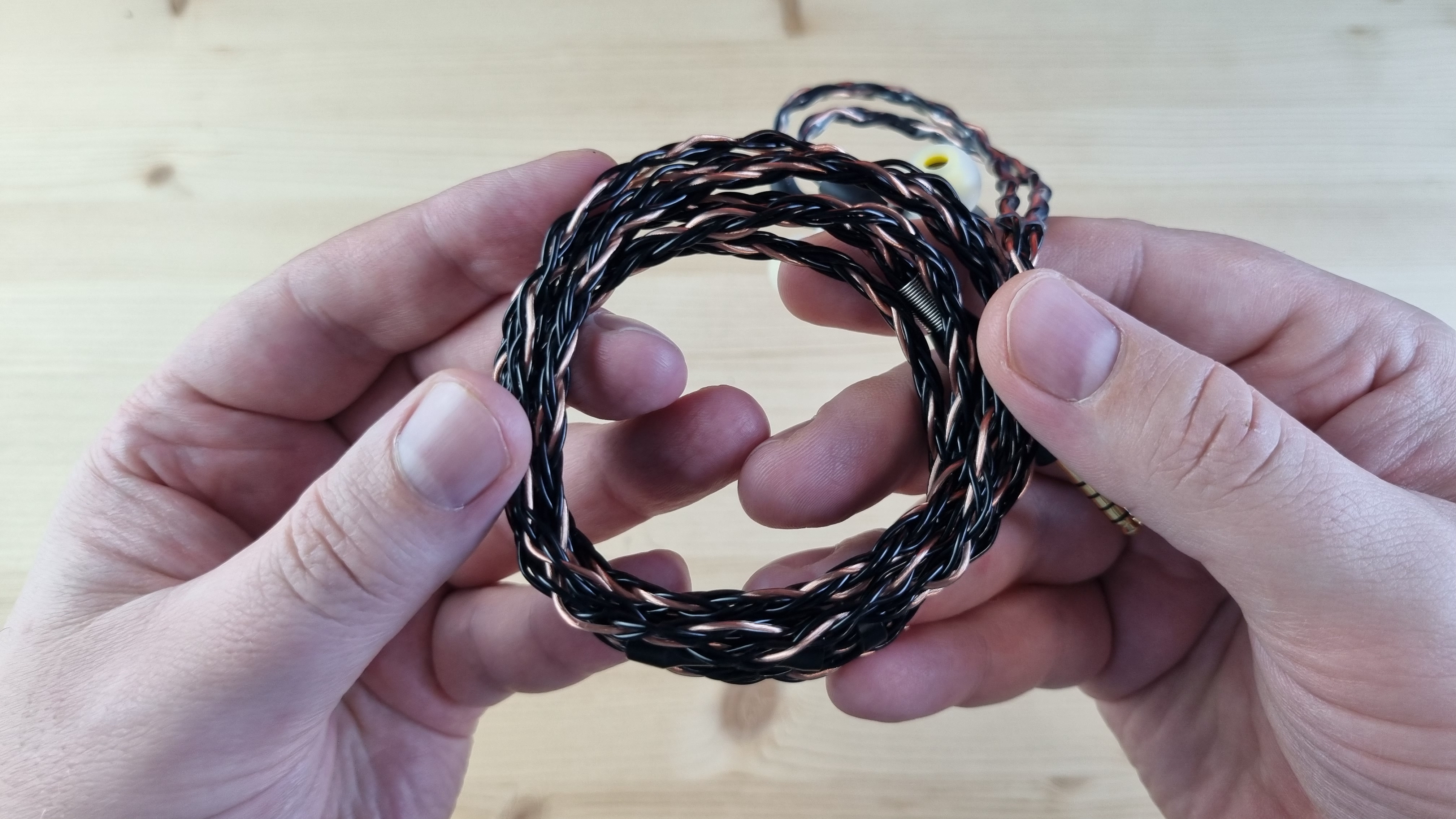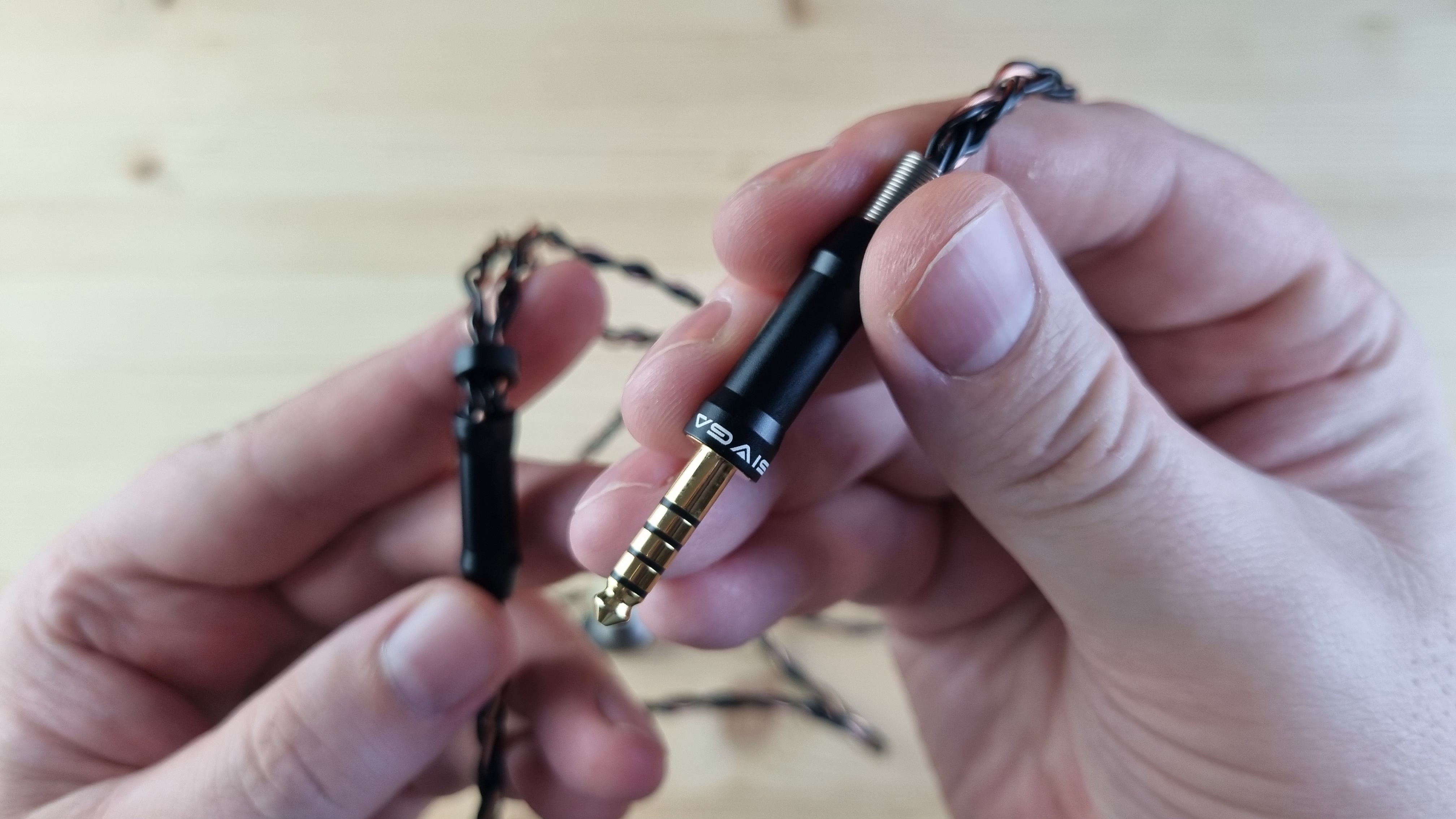 Кабель — толстый, гибкий, витой, сразу на 4.4 мм джек, с сопротивлением всего в 0.1 Ома. Он не совсем стандартный, так что будьте с ним поаккуратнее.
