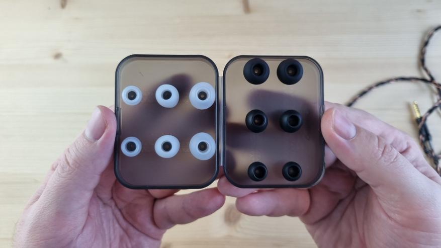 Внутри была инструкция, достойный плотный бокс и два набора силиконовых амбушюр с широким горлышком.