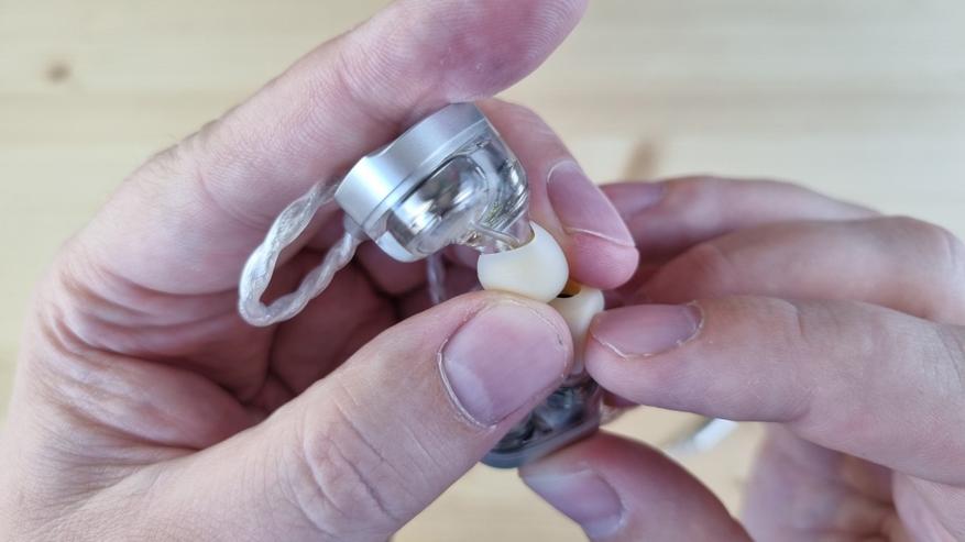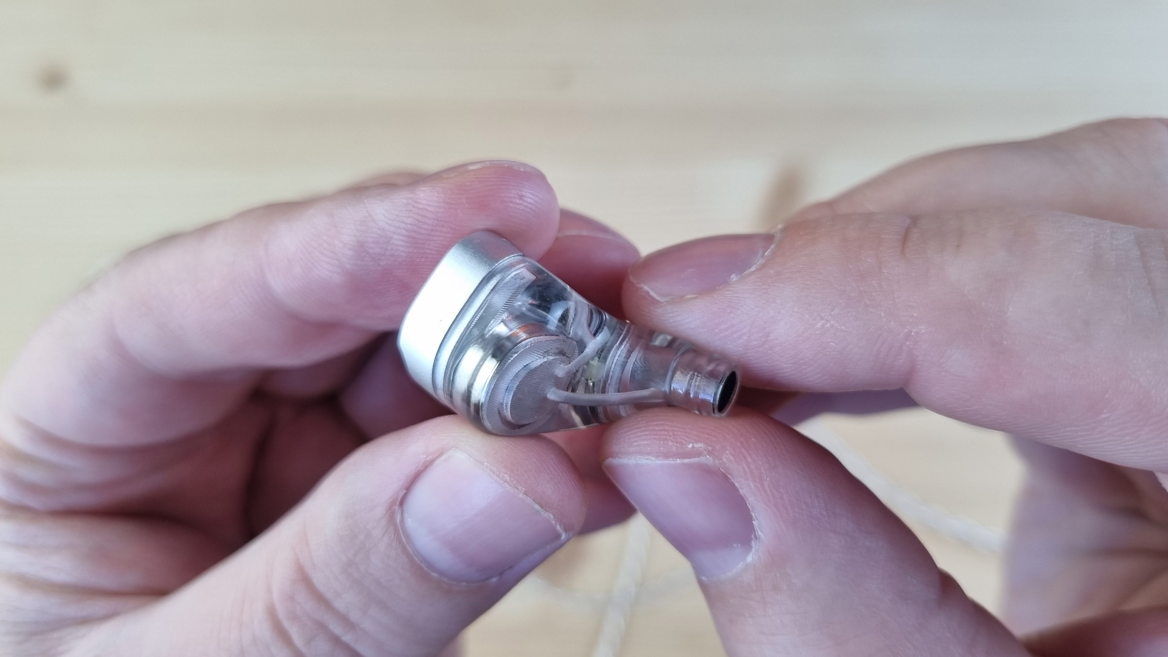 Чашечки из полностью прозрачной медицинской смолы с алюминиевой вставкой на внешней части. Отдельно отмечу прожилки акустических трубок, а также массив отверстий, сверху прикрытый металлической сеточкой. Благодаря чему, собственно, конструкцию можно считать открытой. Окружающим ваша музыка будет немного слышна, внутрь же почти ничего не проникает.