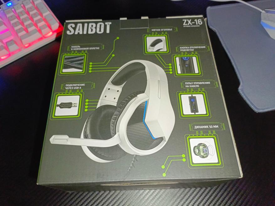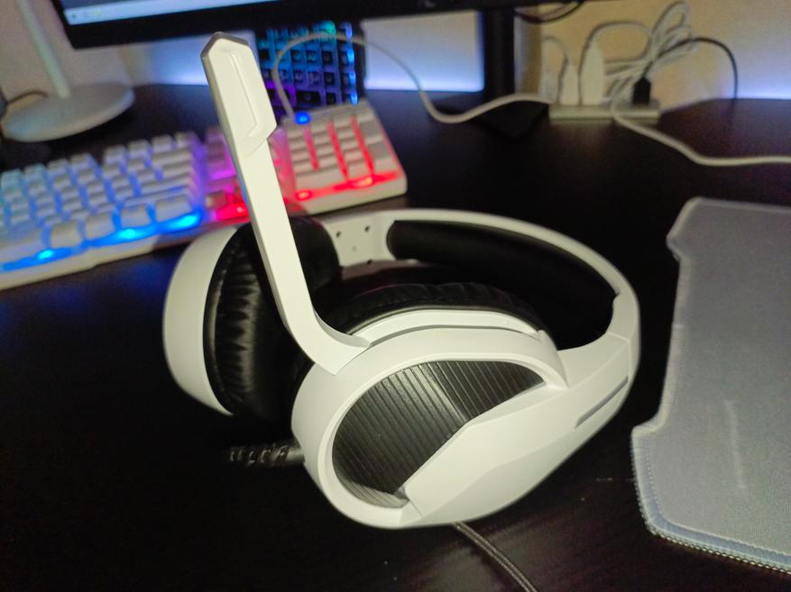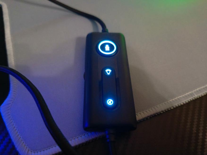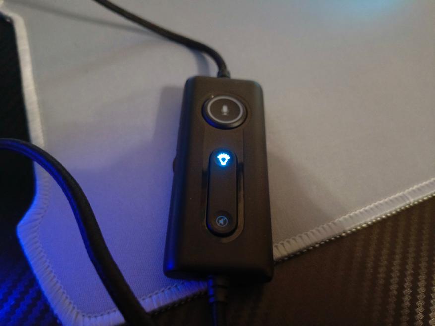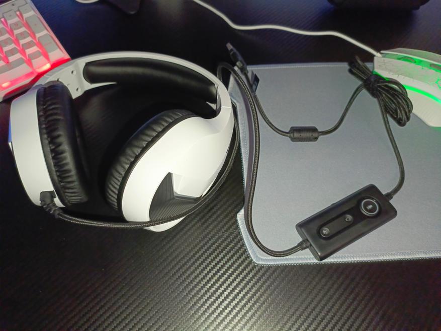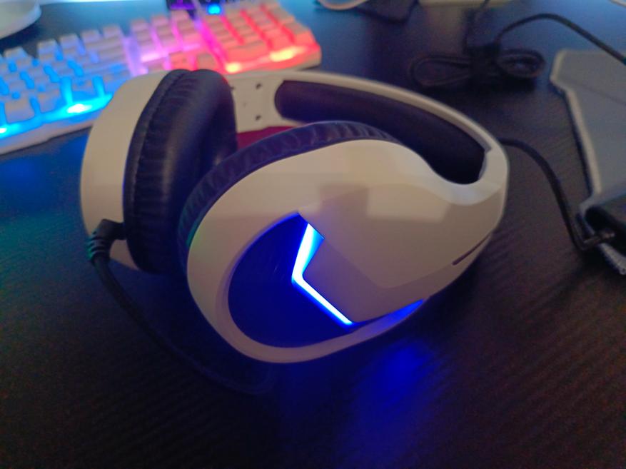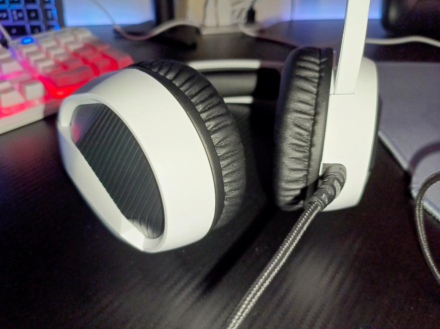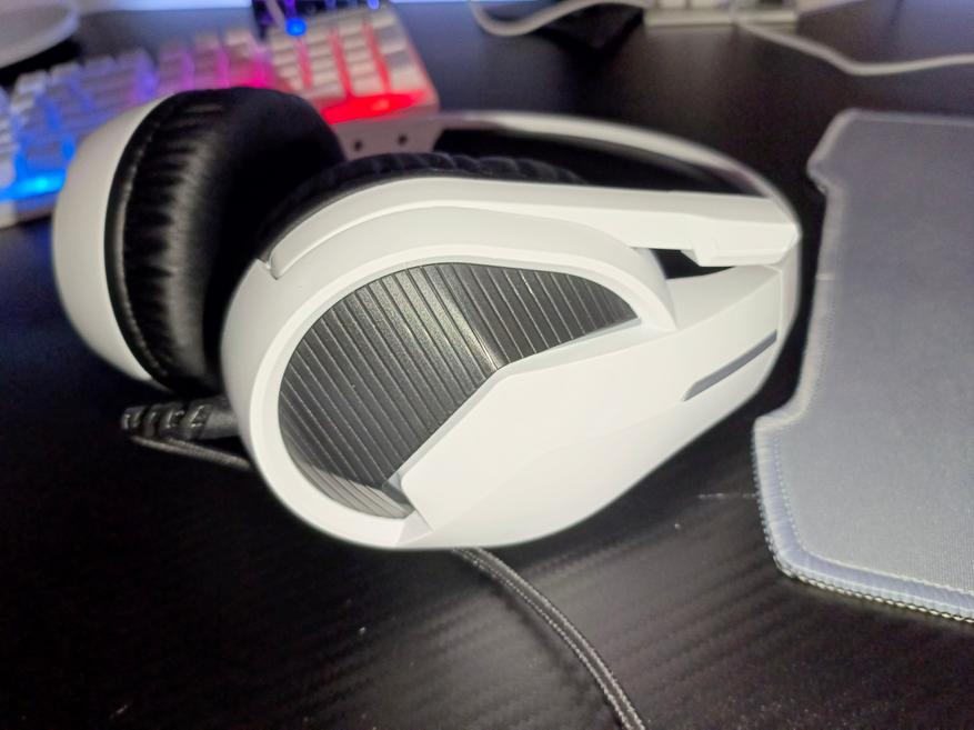 Управление наушниками осуществляется с помощью механических трех кнопок на выносном блоке управления. С помощью него вы можете: приглушить звук, отключить микрофон, а также включить/выключить подсветку. Подсветка смотрится весьма неплохо. Цвет свечения только синий, но он удачно гармонирует на фоне белого цвета корпуса. Чаши подсвечиваются с обеих сторон.
