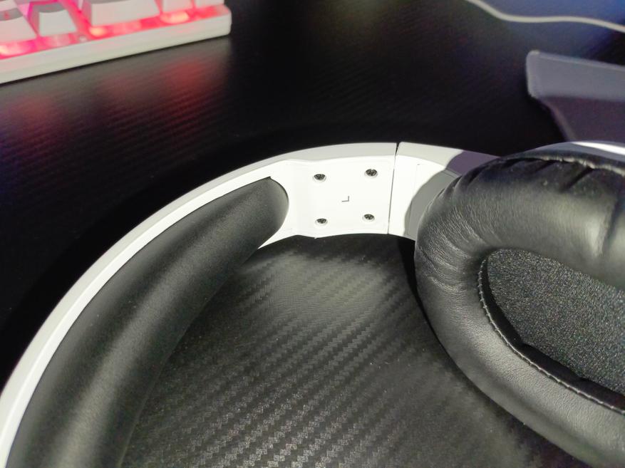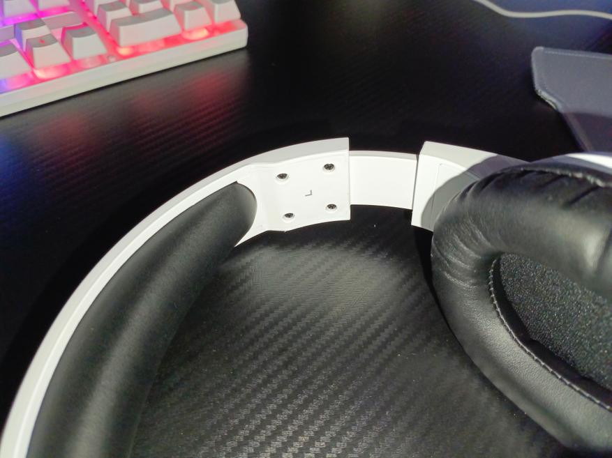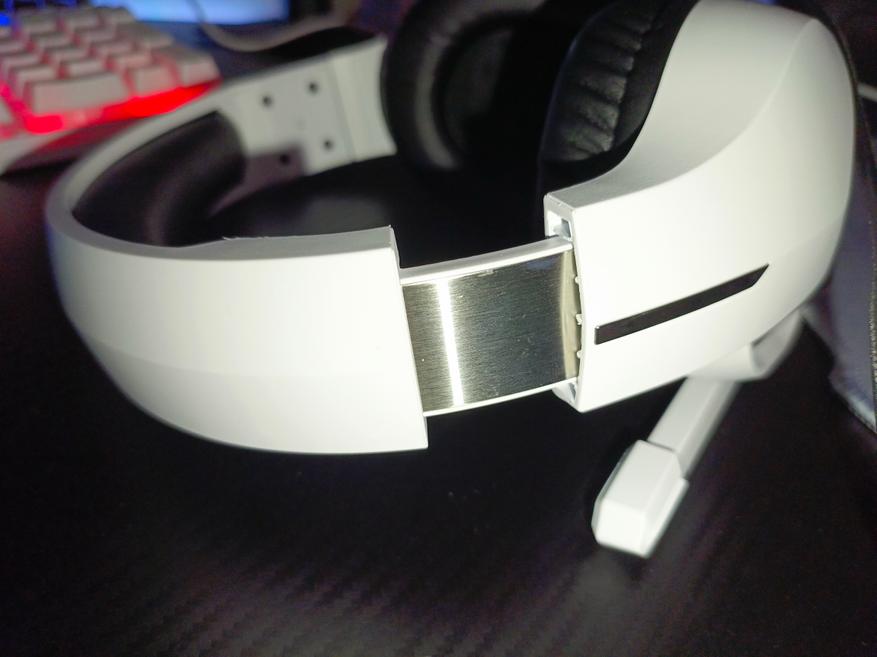 Оголовье также сделано из эко-кожи, такой же, как и амбушюры. Оголовье соединено с чашами с помощью пластиковой направляющей, которая усилена металлической пластиной. С виду выглядит надежно.