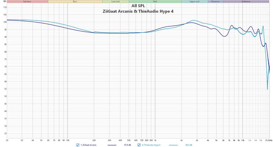 В сравнении с YanYin Canon Pro в конфигурации 11, отличие я вижу лишь на верхах, которые у нас, очевидно, гораздо лучше выражены. ThieAudio Hype 4 имеют свою идеологию с сильнее подчеркнутой верхней серединой и нижней частью высоких частот и чуть ослабленным самым краем диапазона. То есть у нас всё на уровне.