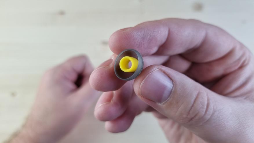 В комплекте идет плотный черный бокс, пара пенок и набор силиконовых амбушюр с желтым сердечником.