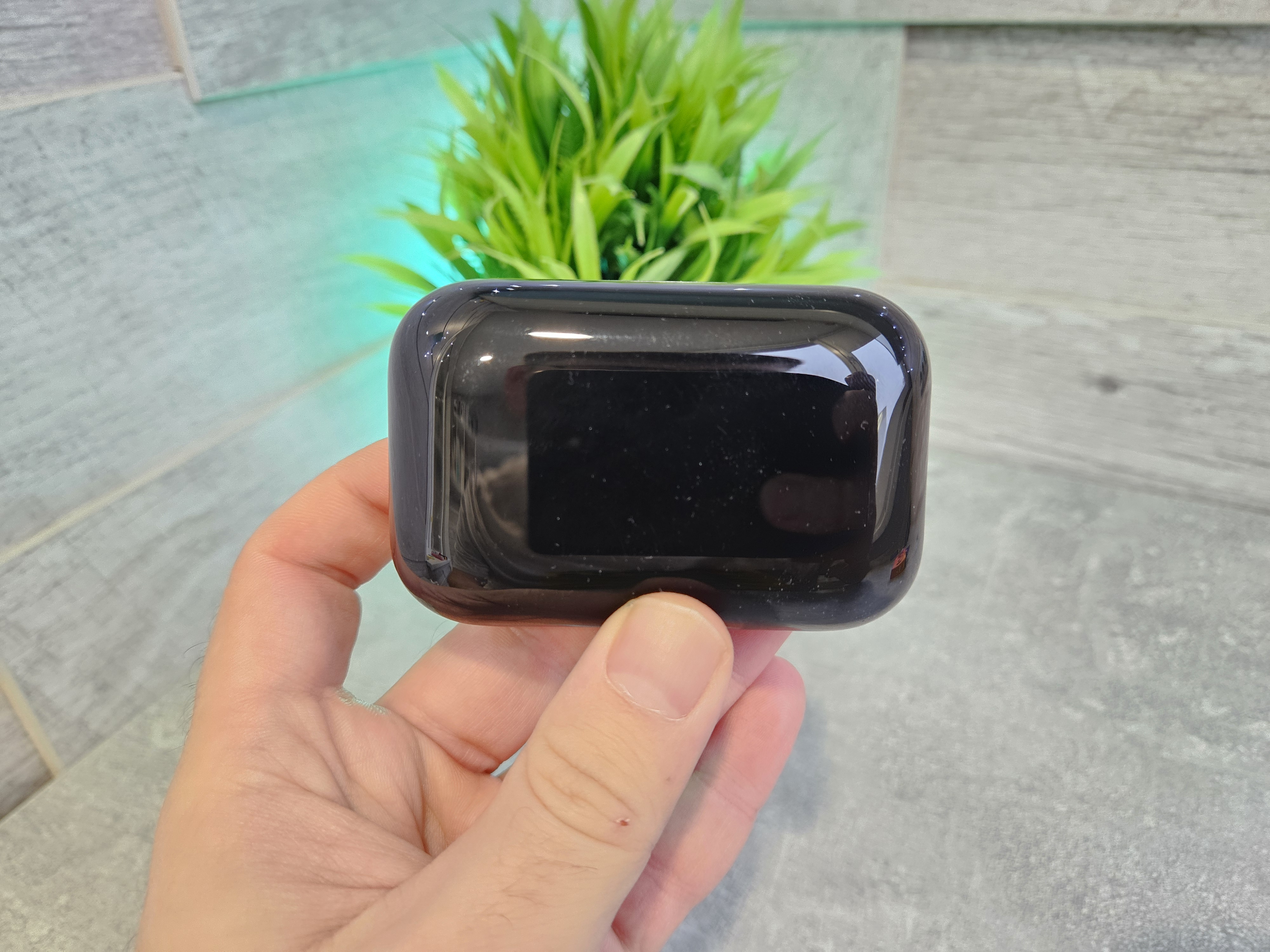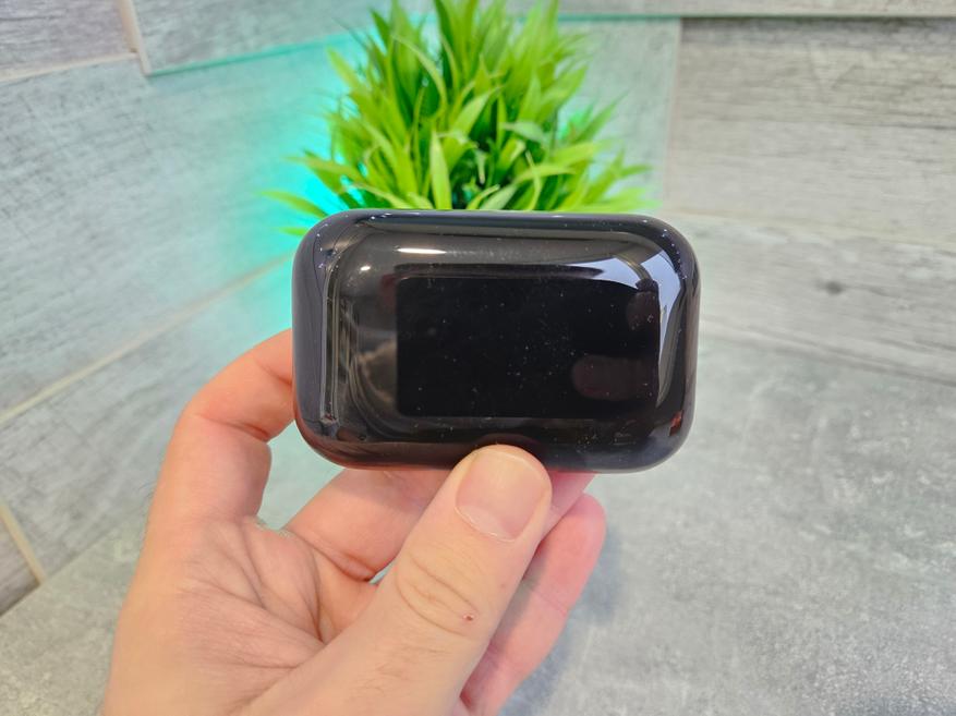 Кейс по форме напоминает брусок мыла черного цвета. Он выполнен из глянцевого пластика, который отлично собирает следы от рук. На переднем торце есть небольшая выемка, чтобы было удобнее пальцами открывать крышку кейса и небольшой светодиод. На правом торце два небольших отверстия, чтобы сделать ремешок самостоятельно. Комплектного ремешка нет. На заднем торце только порт зарядки usb type c и небольшая вставка из серого пластика.