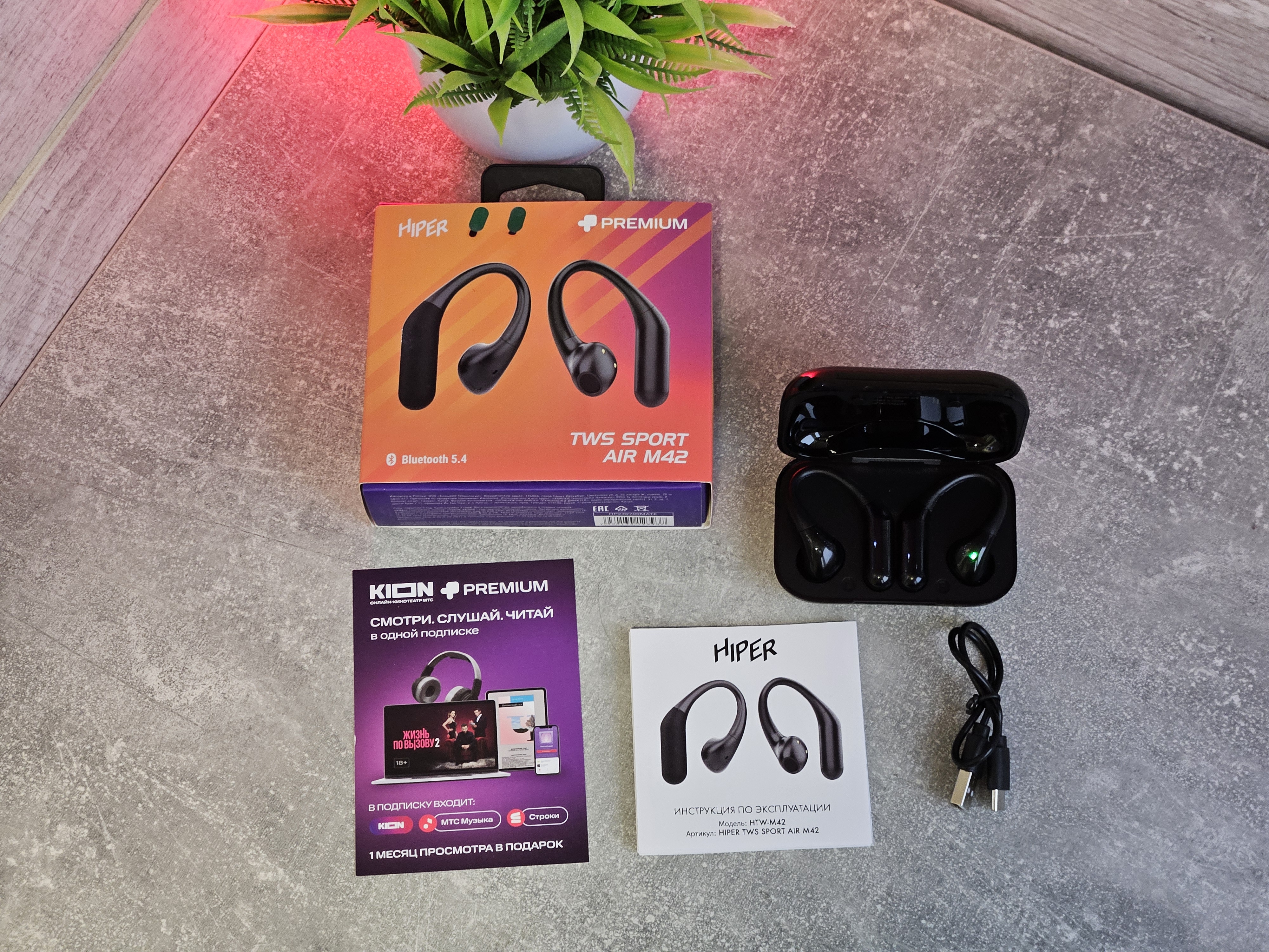 Комплектация минимальная, что ожидаемо. Сами наушники в кейсе, кабель зарядки usb type c, инструкция и буклет с подарочной месячной подпиской на сервис KION.
