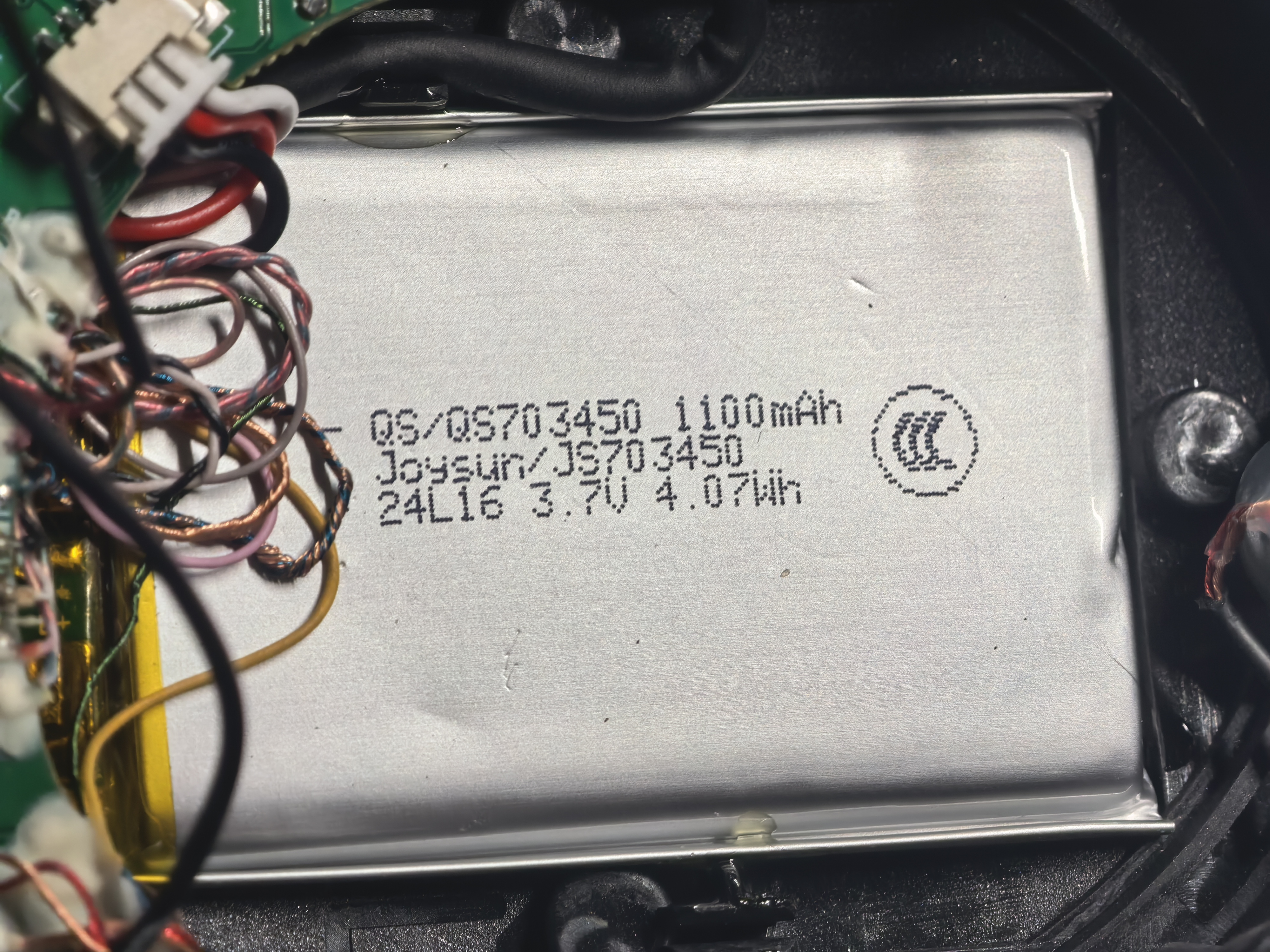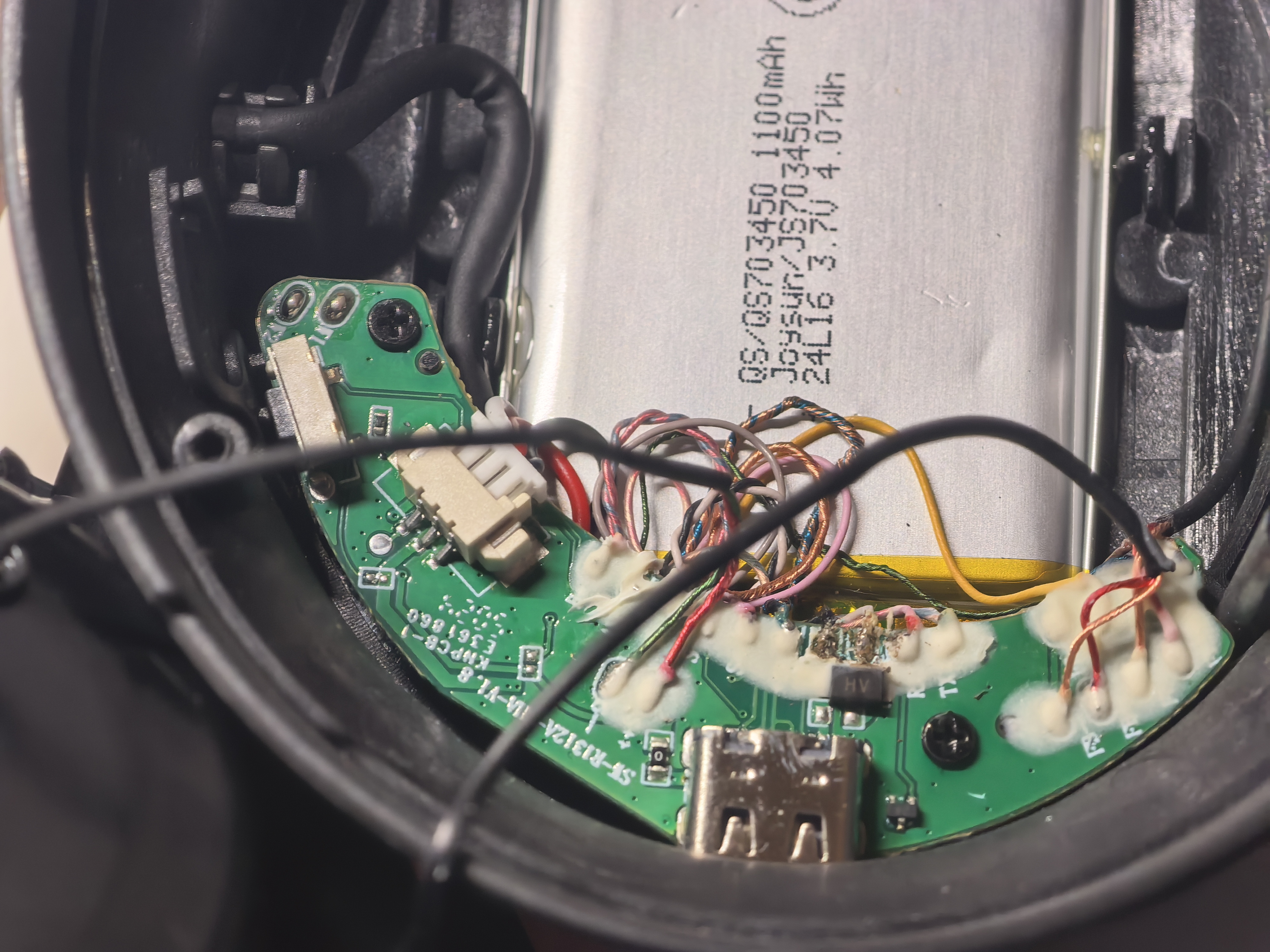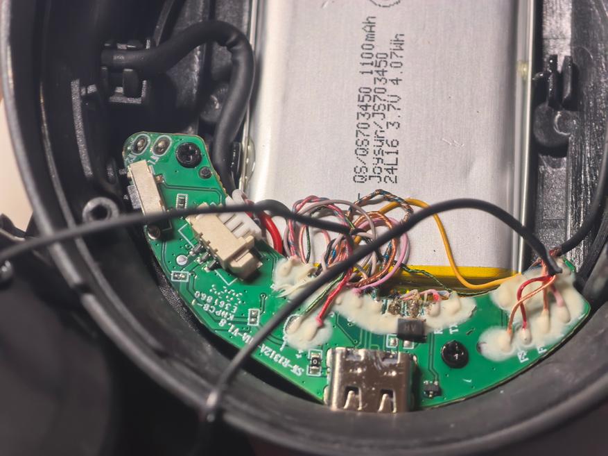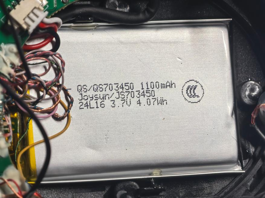 Аккумулятор находится в левой стороне. Его емкость 1100mAh, 4,07Wh. На плате нет явных микросхем с обозначением, что это DAC/AMP. Подобного не увидел и с правой стороны. Производитель заявляет об усилителях.
