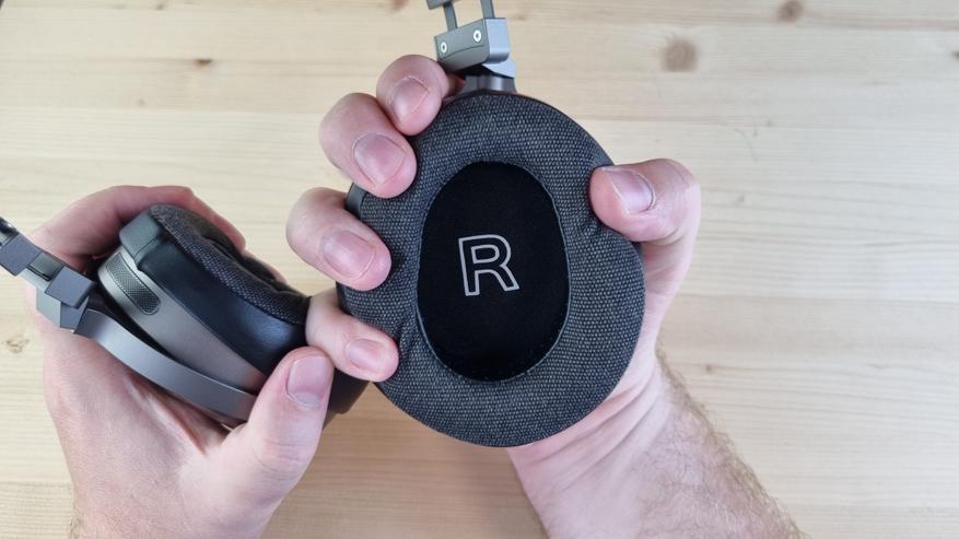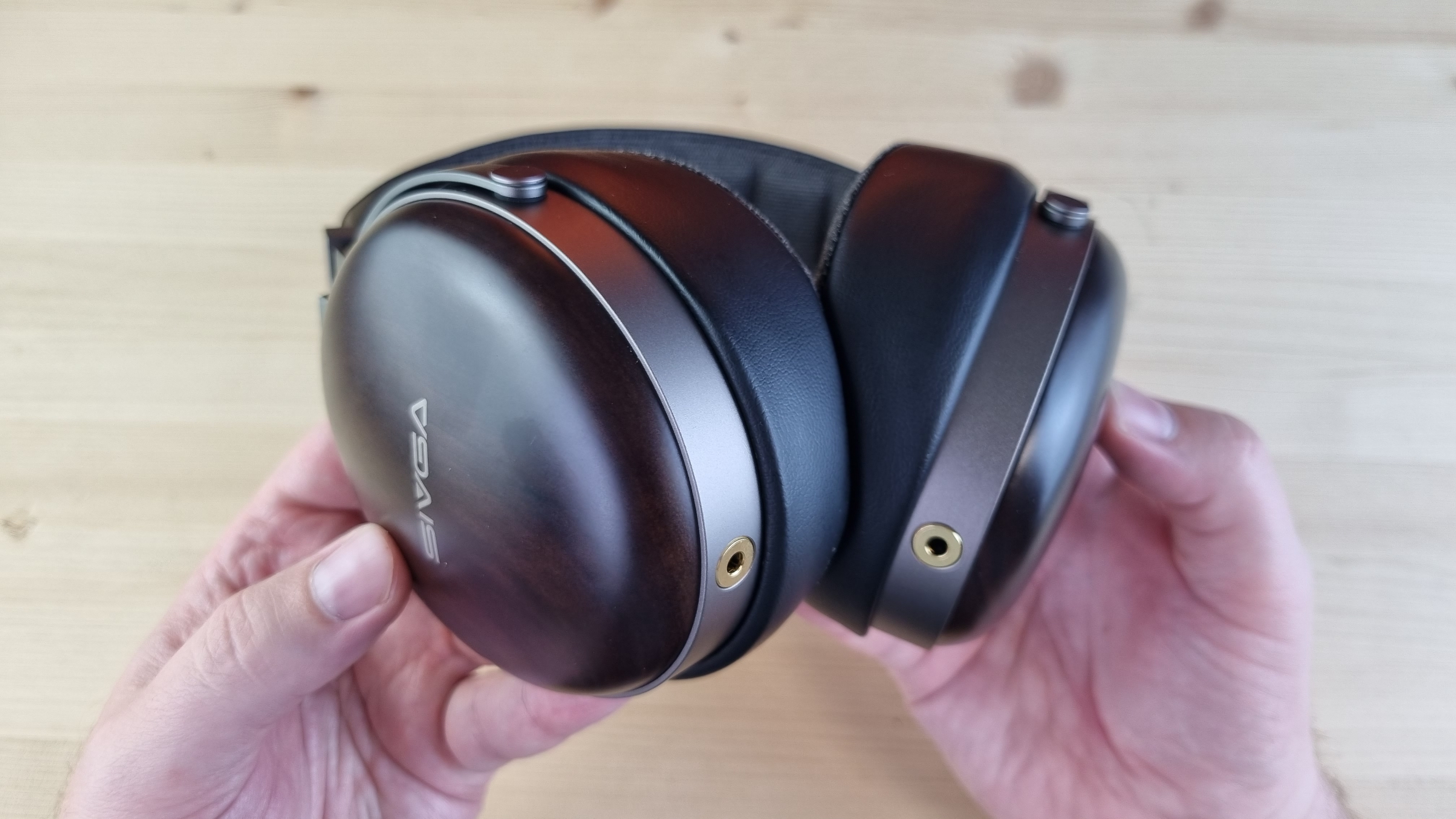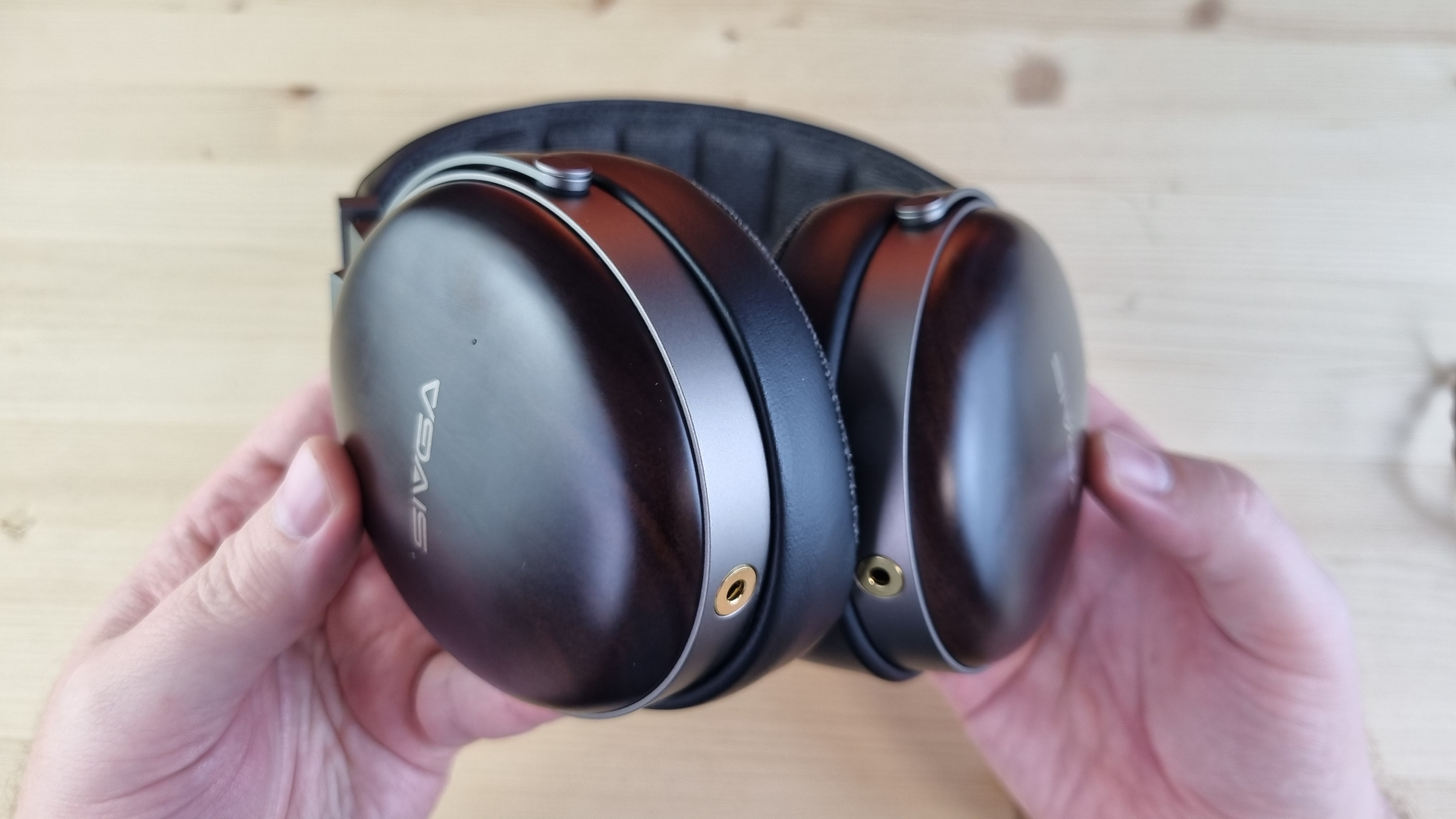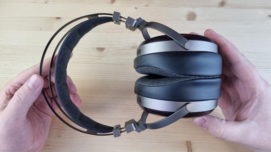 Выглядят наушники ну просто по-царски: округлые деревянные чашечки, вместительные велюровые амбушюры, натуральная кожа в оголовье и исключительно металл в шарнирах.