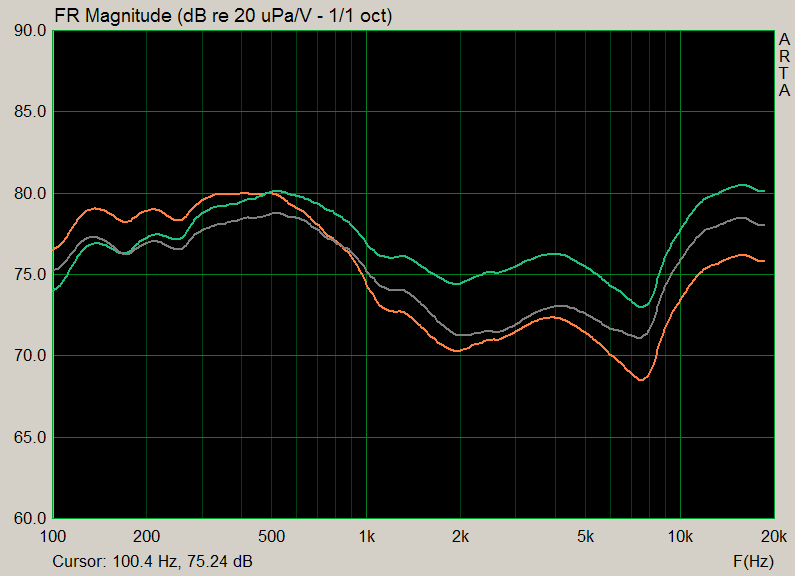 Работа эквалайзера продемонстрирована ниже (три настройки переключаются соответствующей кнопкой, длительное нажатие сброс на настройку по умолчанию). Серая кривая — по умолчанию.