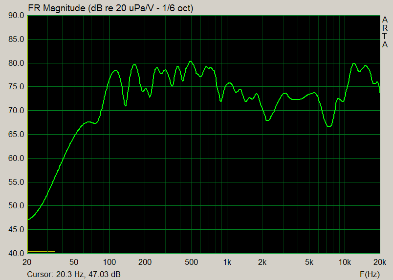 АЧХ устройства измеренная с расстояния 1 метр (микрофон WM-61). ПО на ПК ARTA, источник линейный вход.