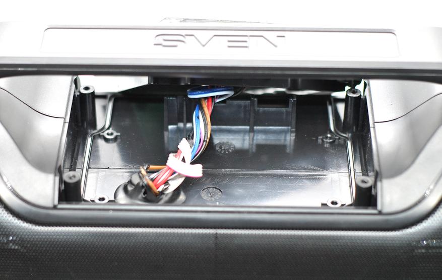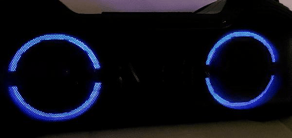 Вкруг пары динамиков имеется RGB подсветка, она мигает в такт музыке. Вечером смотрится вполне нарядно, а если мешает, отключить ее можно нажатием на одну кнопку (соответственно с изображением светящейся лампочки).