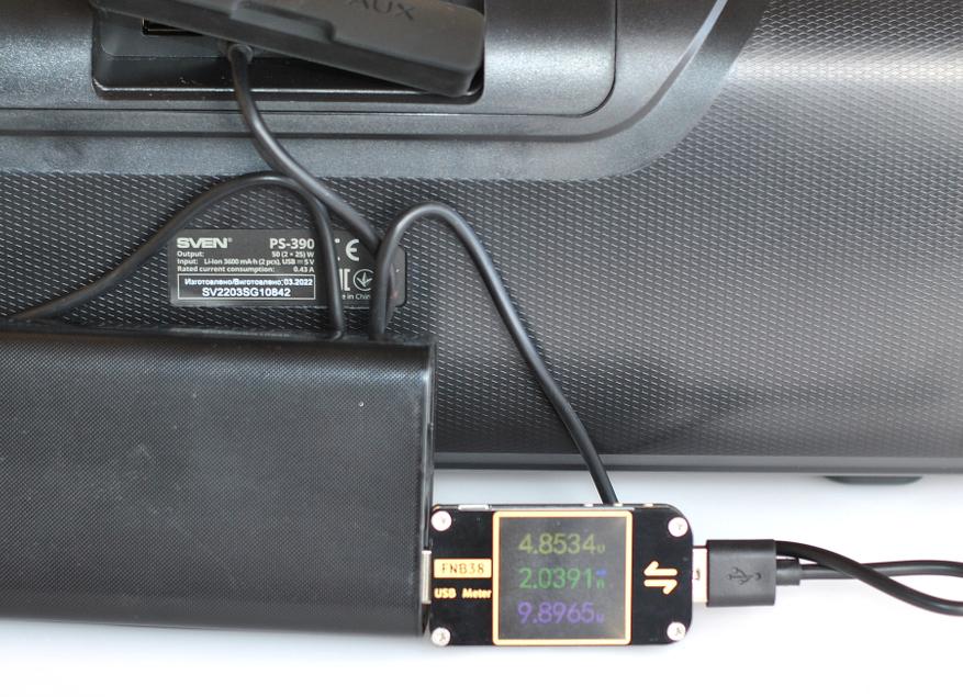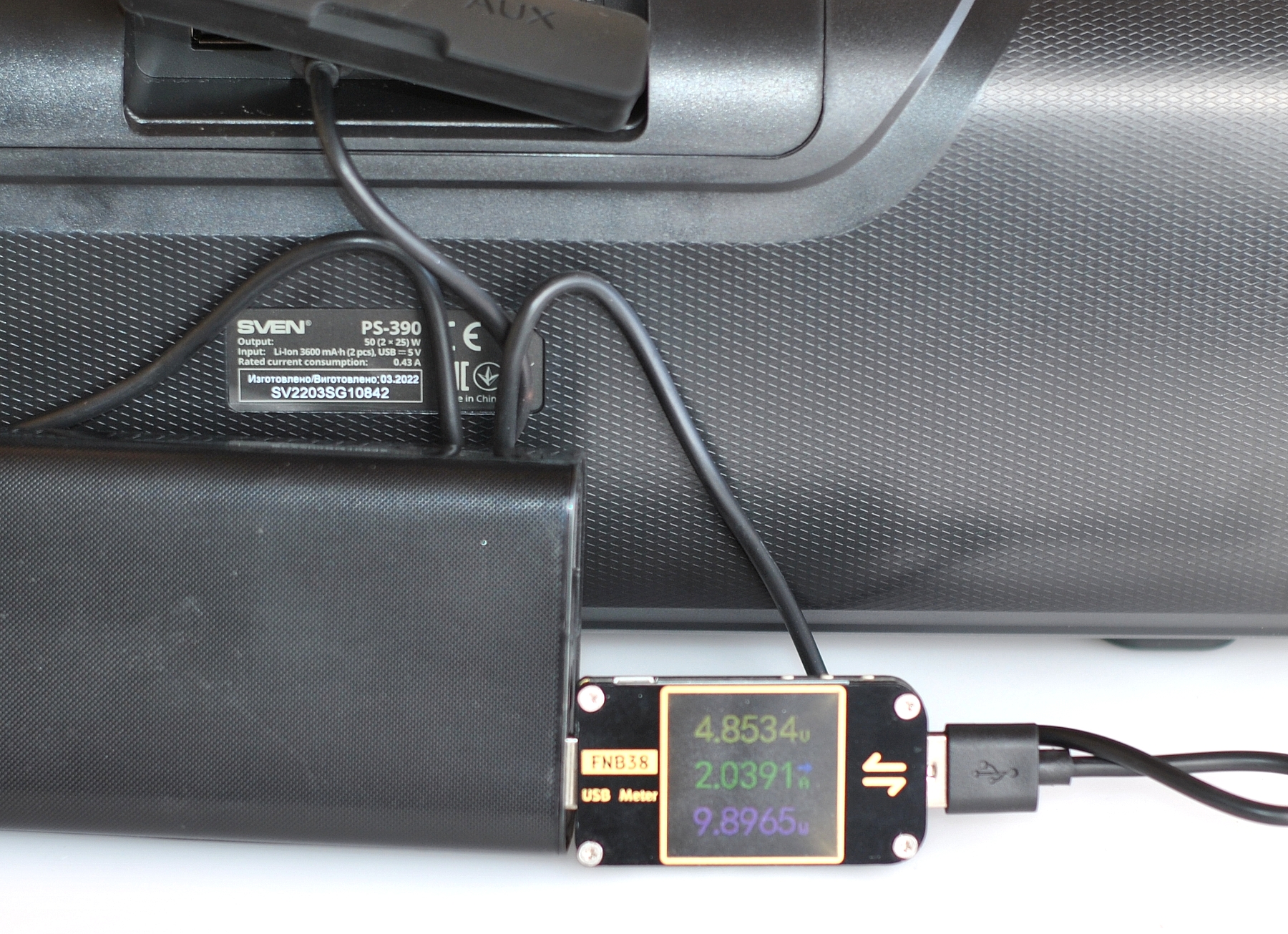 Зарядка Sven PS-390 идет током 2 А и проходит за 3+ часа.