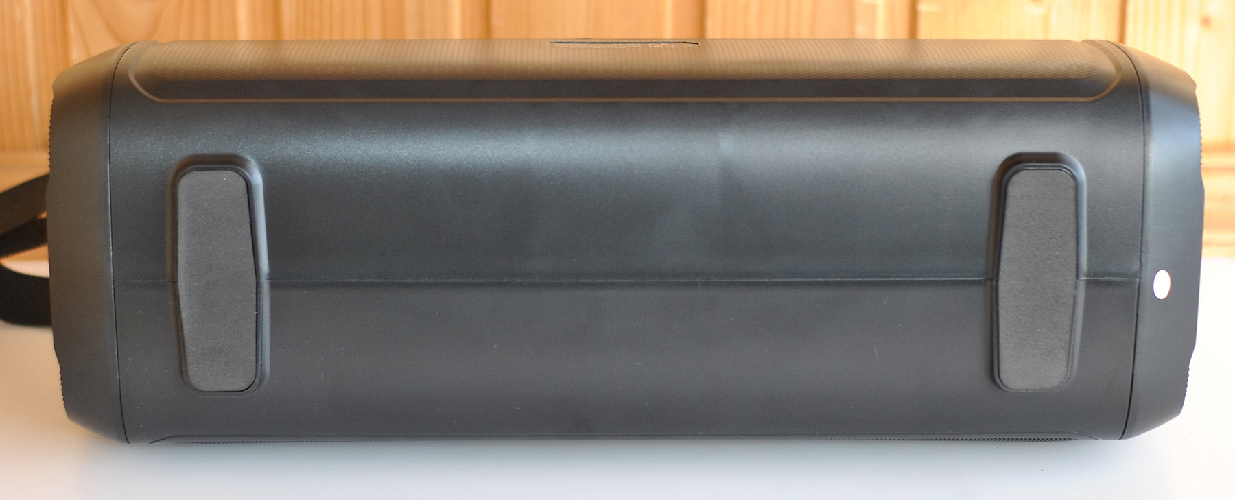 Управление акустикой реализовано на крупных прорезиненных кнопках с пиктограммами, все понятно без руководства. Кнопка включения (она же переключение входов) с подсветкой. Для режима TWS (стерео пара из двух одинаковых колонок выделена отдельная кнопка). Индикатор заряда батареи выполнен из четырех светодиодов. Рядом микрофон для громкой связи.