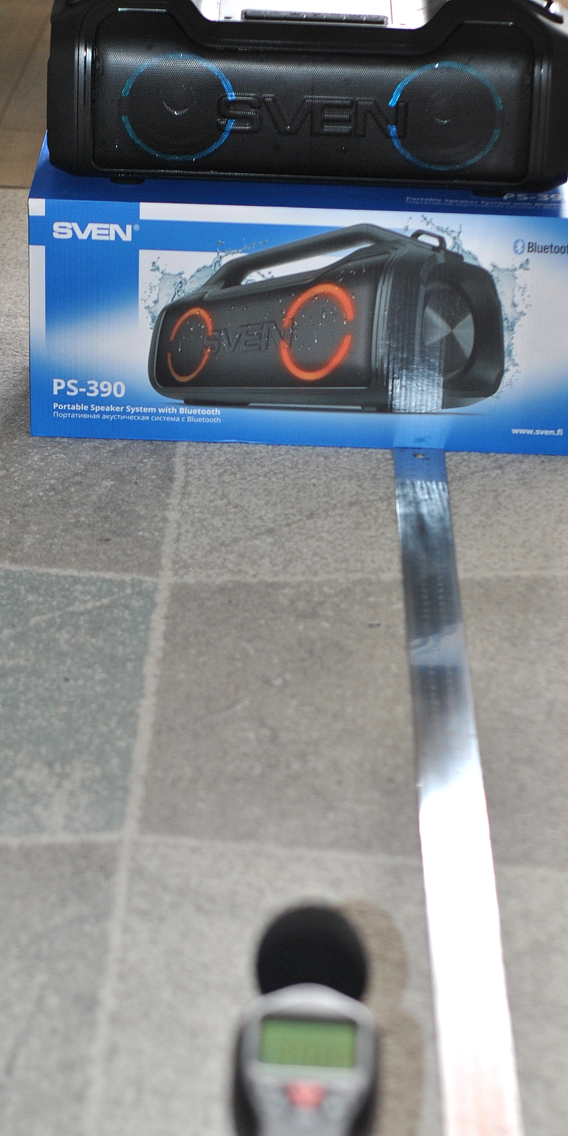 Запас по громкости у модели достаточный. На максимуме срыва на хрипы не замечено. Для примера, уровень звукового давления колонки на сигнале синус 1 кГц с расстояния 1 метр.