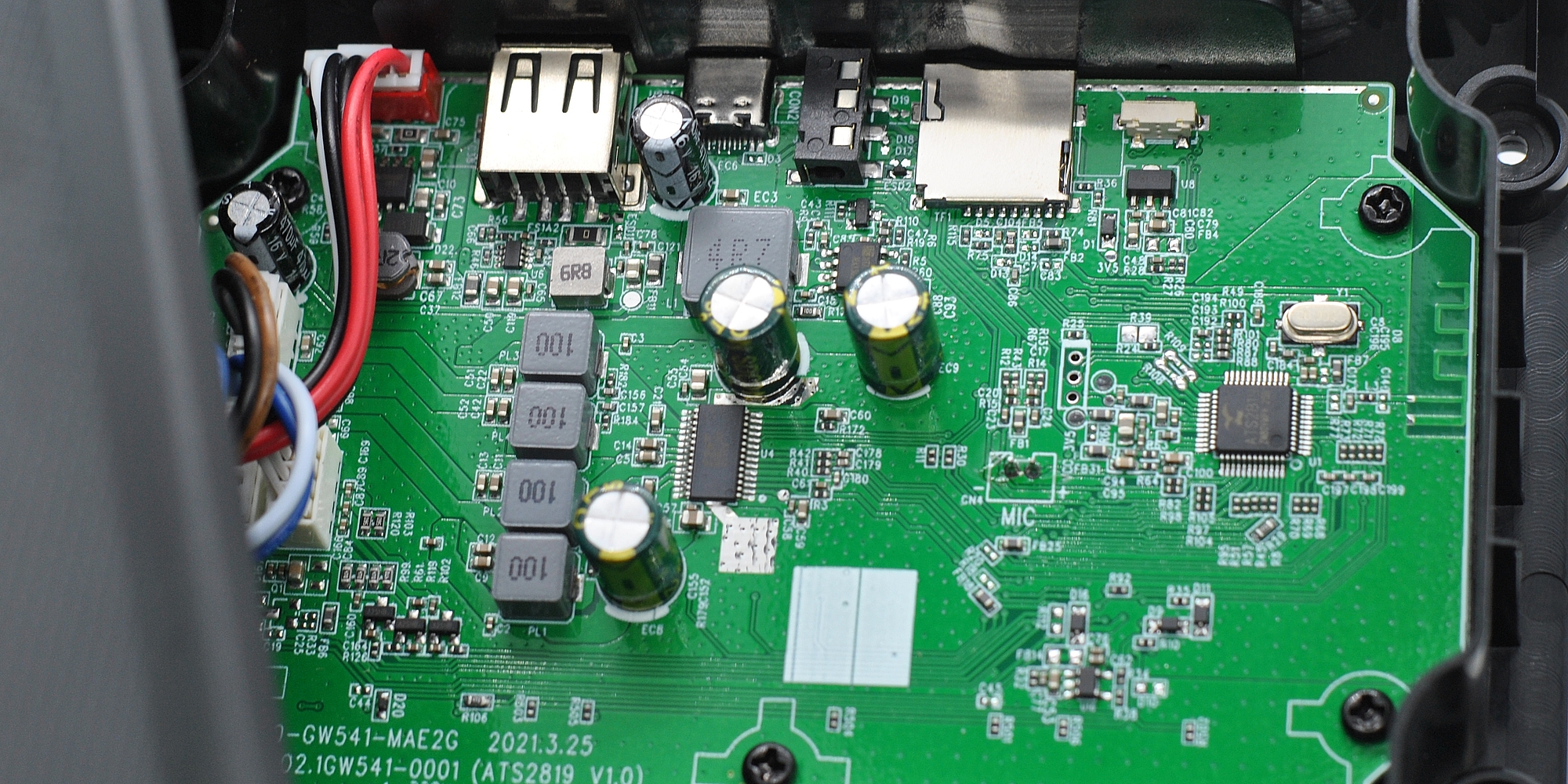 Замечены: Bluetooth v5.0 SoC ATS 2819 и аудиоусилитель класса D ESMT AD82128 2х25 Вт с бустом напряжения.