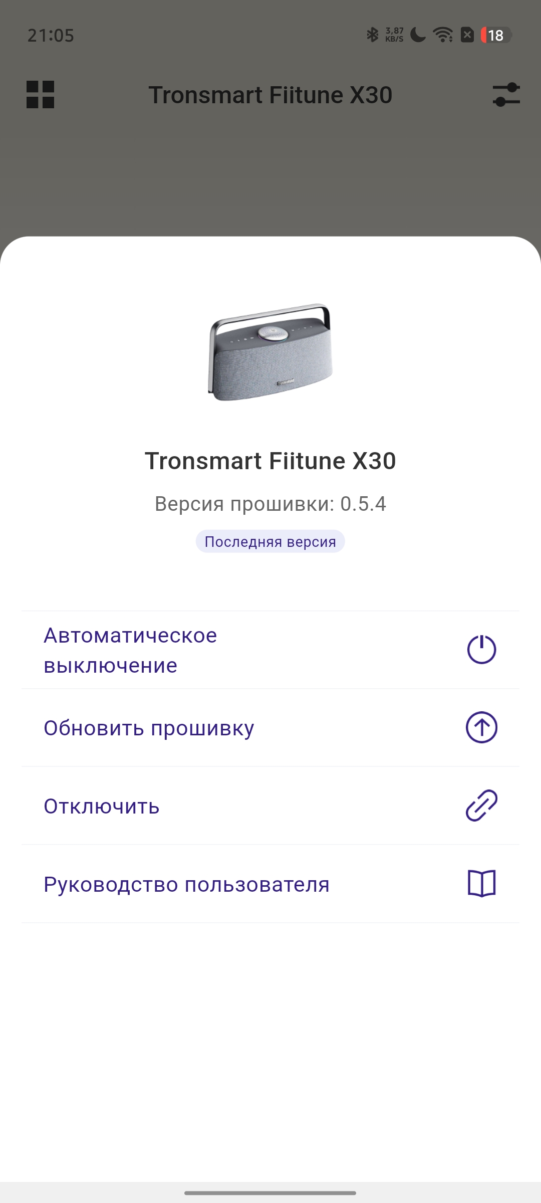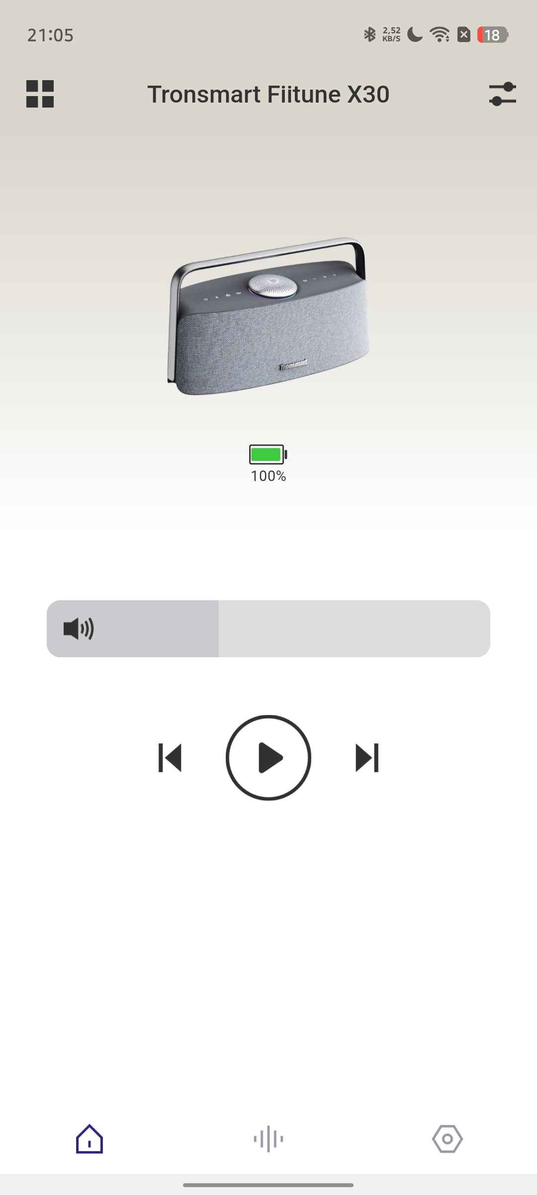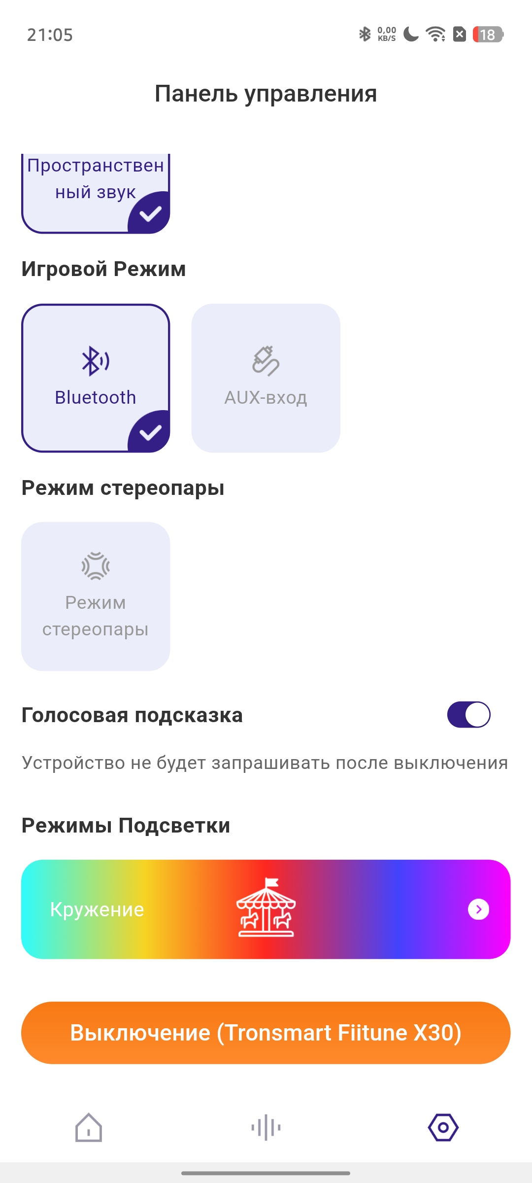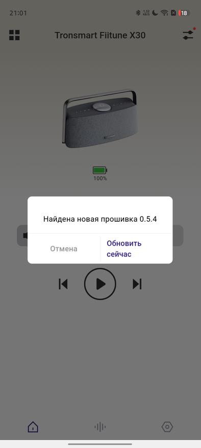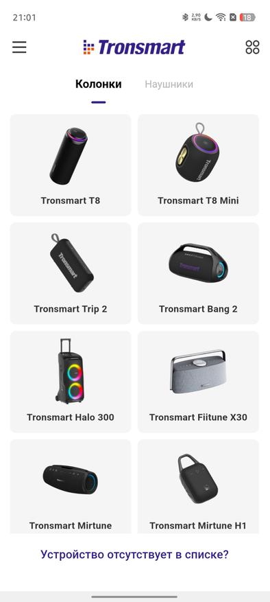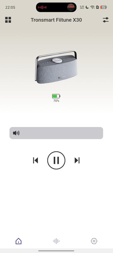 Как и многие современные портативные колонки, Tronsmart Fiitune X30 поддерживает работу с фирменным мобильным приложением. После подключения попадаем в главное меню, которое будет знакомо владельцам устройств бренда — оно остается единым для разных моделей.