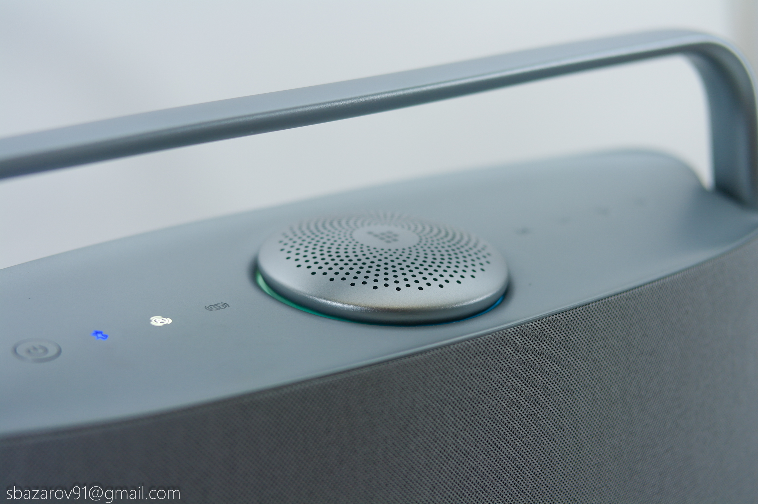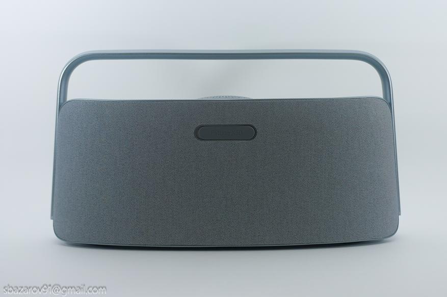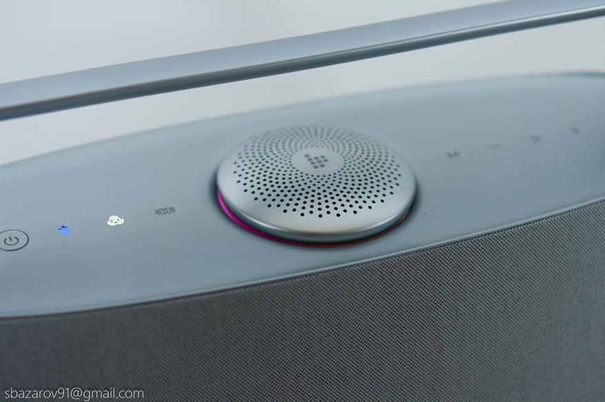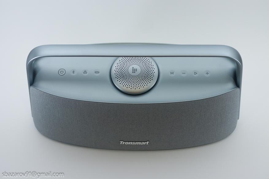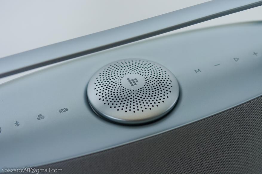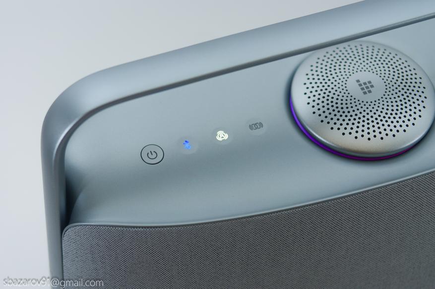 Управление колонкой вынесено на верхнюю панель, которая стилизована под шлифованный алюминий, но является пластиковым элементом. При этом пластик не прогибается от нажатия и выглядит качественно. Практически все кнопки сенсорные, за исключением кнопки включения — она физическая и имеет красную светодиодную подсветку.