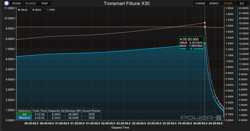 Кстати, что насчет процесса зарядки? Tronsmart Fiitune X30 поддерживает Power Delivery 3.0, но максимальное потребление ограничено 15,1 Ваттами (9,1В/1,65А). В таком случае полная зарядка занимает 4 часа 30 минут, а «залитая» ёмкость составляет 6,4 А·ч (58,5 Вт·ч).